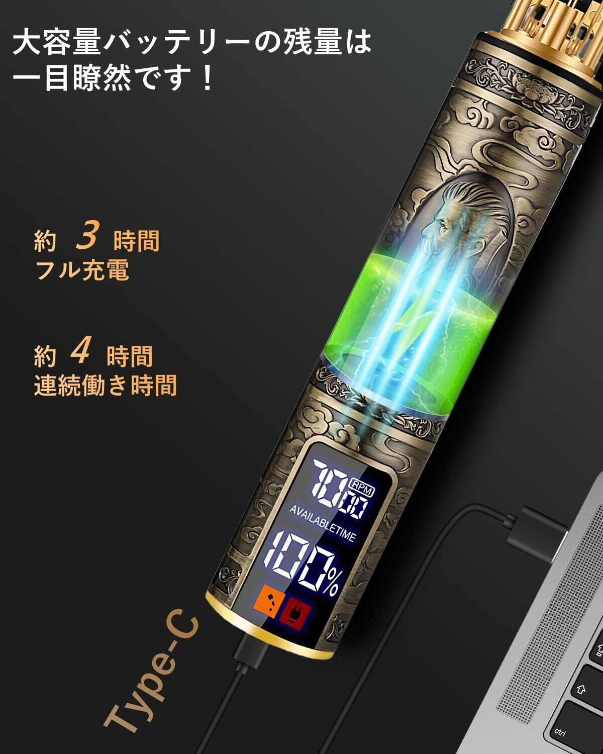 【LEDディスプレイ付き&USB充電式&お手入れ簡単】 電動バリカンにはLEDディスプレイが搭載されており、ばりかんの充電状況、スピードレベルと使用状況充電状況は一目瞭然で、もっとよく散髪することを対応可能です。Type-C充電式で、1回の充電で最大240分の連続使用が可能です。充電式で、コードレス、小さくて軽く、持ち運びにも便利なので、家族、旅行、ビジネス、どこでも使いやすいです。バリカンの刃は水で洗うことができ、刃や体に付着した小さなゴミを落とすことができる掃除ブラシも付いています。 充電口はバリカンの底にあるので、全身を水洗いすることはできない。