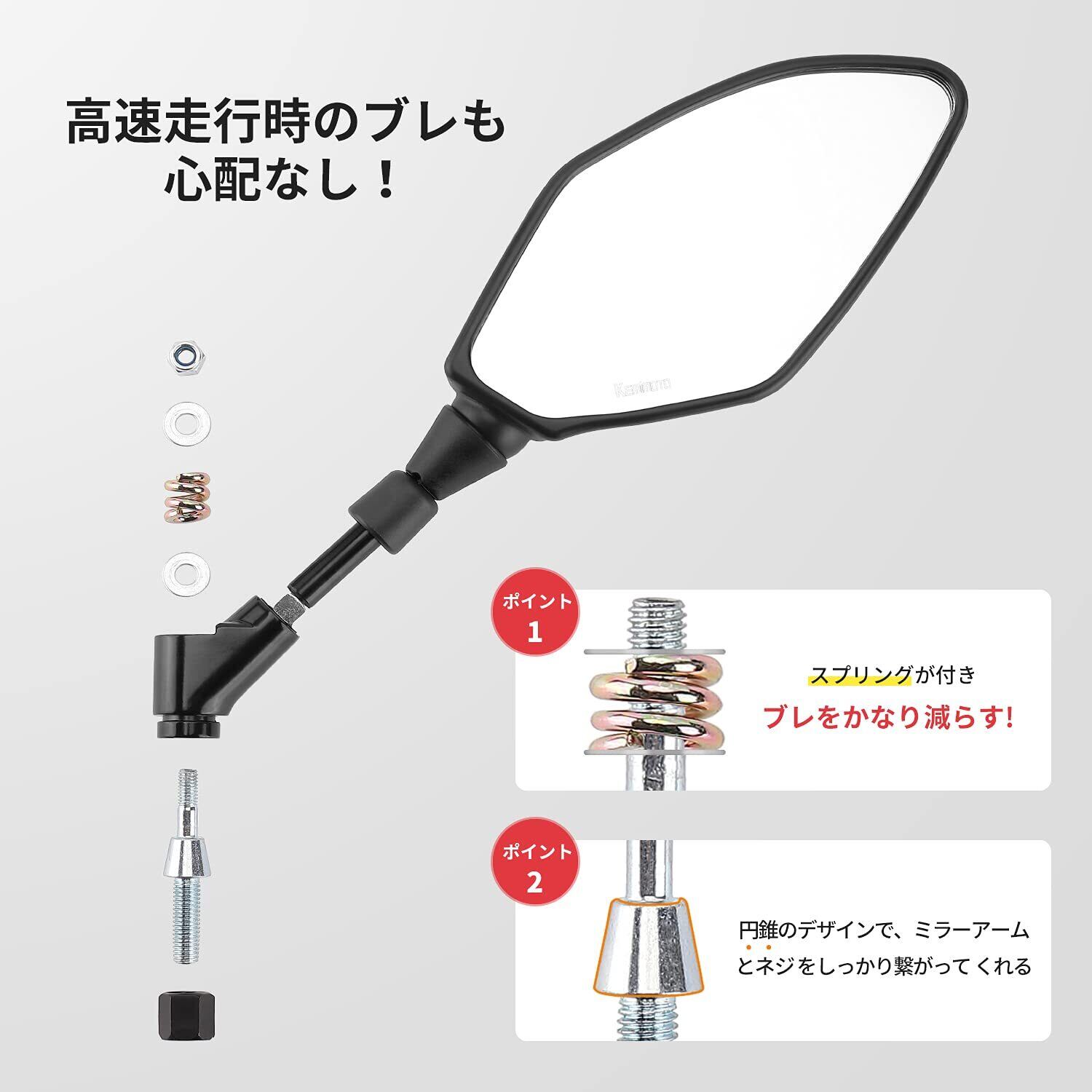 【車検対応】当該ミラーは車検/安全基準に対応されます。【セット内容】左右セット、10MMネジ*3(正ネジ2個、逆ネジ1個)、8MMネジ*3(正ネジ2個、逆ネジ1個)、防水キャップ2個、ピッチ1.25。材質:CNC加工、ABSプラスチック
