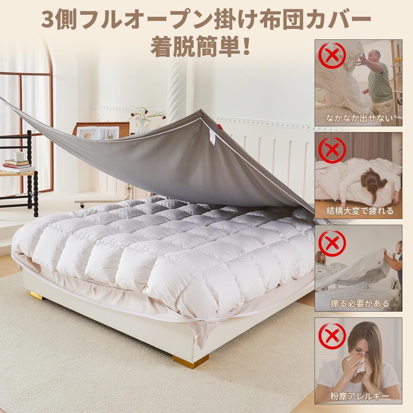 【鼻アレルギーの方を守る】当社の布団カバーは3側側面に全開ダブルファスナーをつける技術を採用します。羽毛布団を振ることなく、布団をカバーに入れて広げた後、4~8箇所のボタンで布団が動かないように固定し、最後にジッパーを閉じるだけで簡単にカバーの交換が完了します。これにより、ダニやアレルゲンの拡散を防ぎ、鼻が敏感な方でも安心して布団カバーの交換ができるようになります。