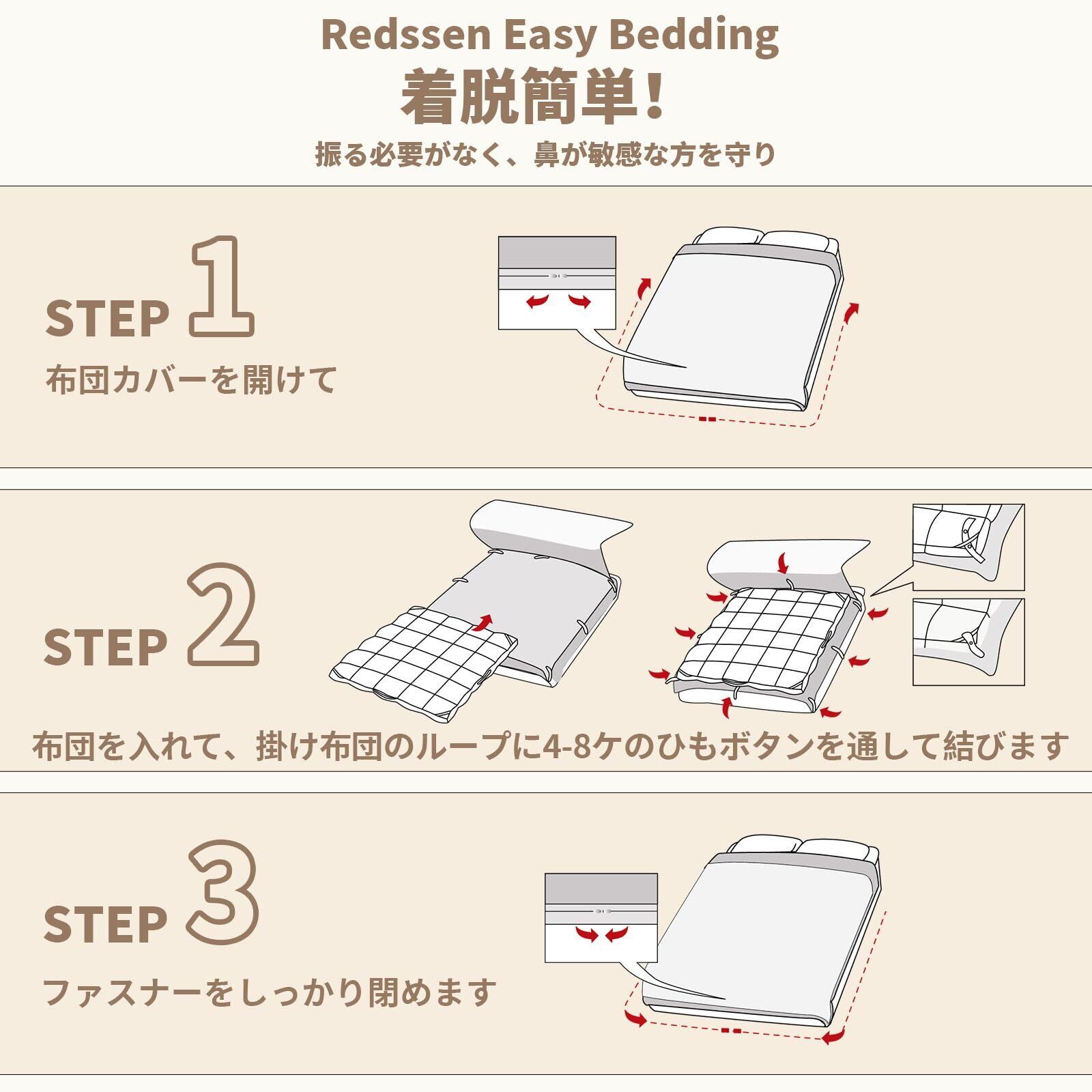 【Redssen Easy Bedding掛け布団カバー】便利さを重新定義。3側に開くデザインで、布団の交換をこれまでにないほど簡単に、スムーズに。当かけぶとん カバーは使いやすさにこだわりカバーの3側側面に全開ダブルファスナーをつけました。ぐーんと大きく開くので大変なふとんの出し入れがスムーズにできます。隠しジッパーとズレ防止8ヶ所紐付きで、使いやすさを実現しつつ、寝心地の良さも損ないません。手間を省き、快適でストレスフリーな睡眠環境を提供する、革新的な掛け布団カバーです。