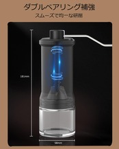 ユニークなデザイン: 人間工学に基づいたデザイン, 快適な感触, 長めのステンレスハンドルは, 豆を挽く手間を省き. コーヒー豆を挽く楽しみを提供します, ダブルベアリングセンターシャフト, 正確なギア調整により. 透明なガラスボトルは耐久性であり挽いた量を一目でわかる.