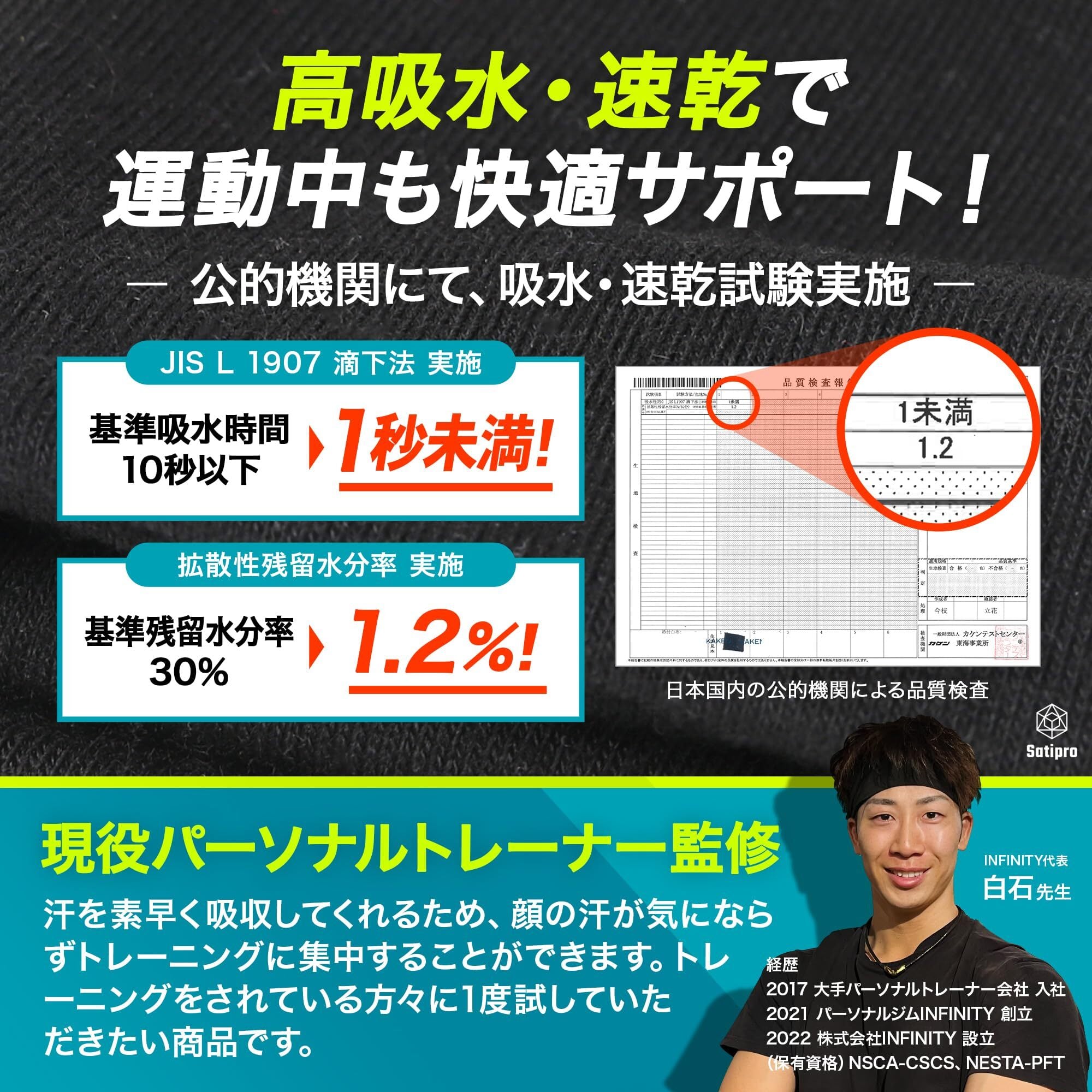 【速乾性も備えた優れた生地】吸水性が高いだけのヘアバンドでは、汗がヘアバンドに留まり続けてしまい、トレーニング中やその後に不快感を感じることがあります。そこで、速乾性の試験も実施し、一般的な基準である30%に対し、当ショップの商品はわずか1.2%という結果を達成しました。優れた吸水性に加え、速乾性も備えているため快適にご使用いただけます。