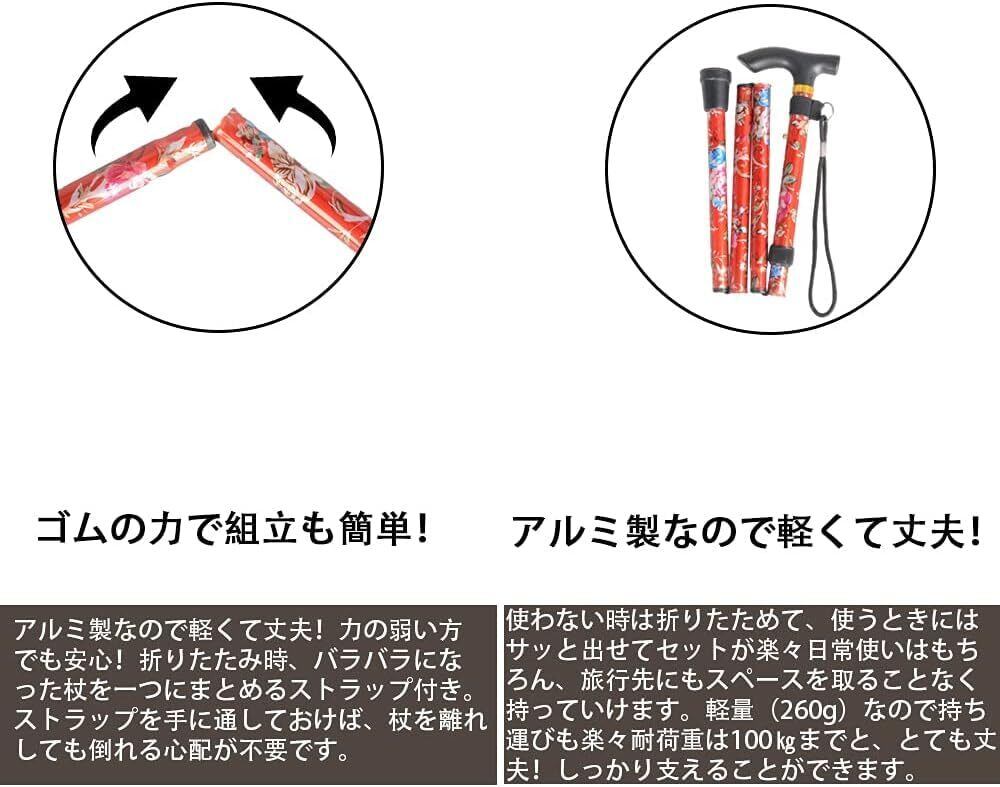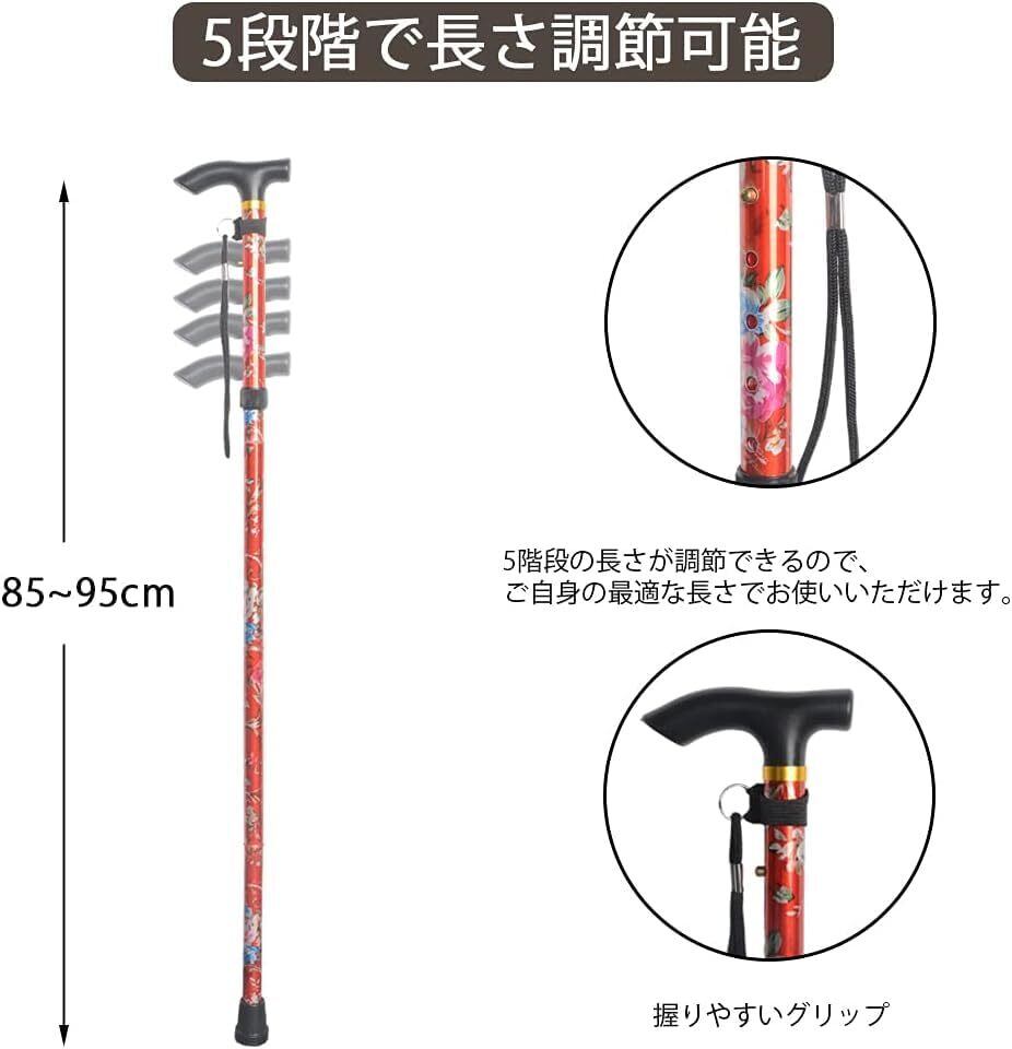 【商品仕様】杖全長:約85cm~95cm 。補助機能:1点式足、5段階伸縮機能、ゴム足、ストラップ。耐荷重:90㎏。※検査・検品はしておりますが、万が一の初期不良、取扱い説明書に沿った正常なご使用状態で故障した場合は、お買い上げ後6か月間無料で交換いたします。