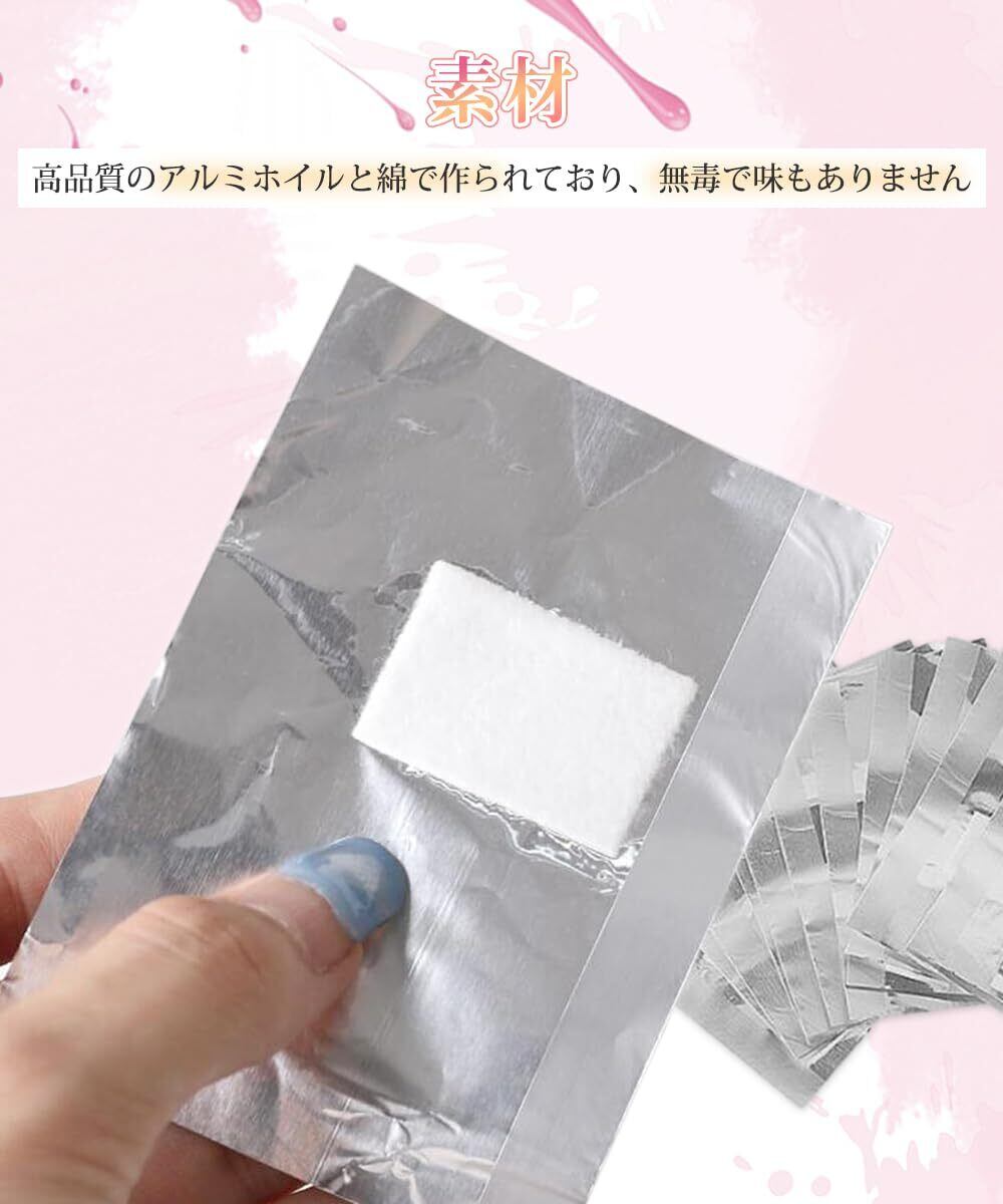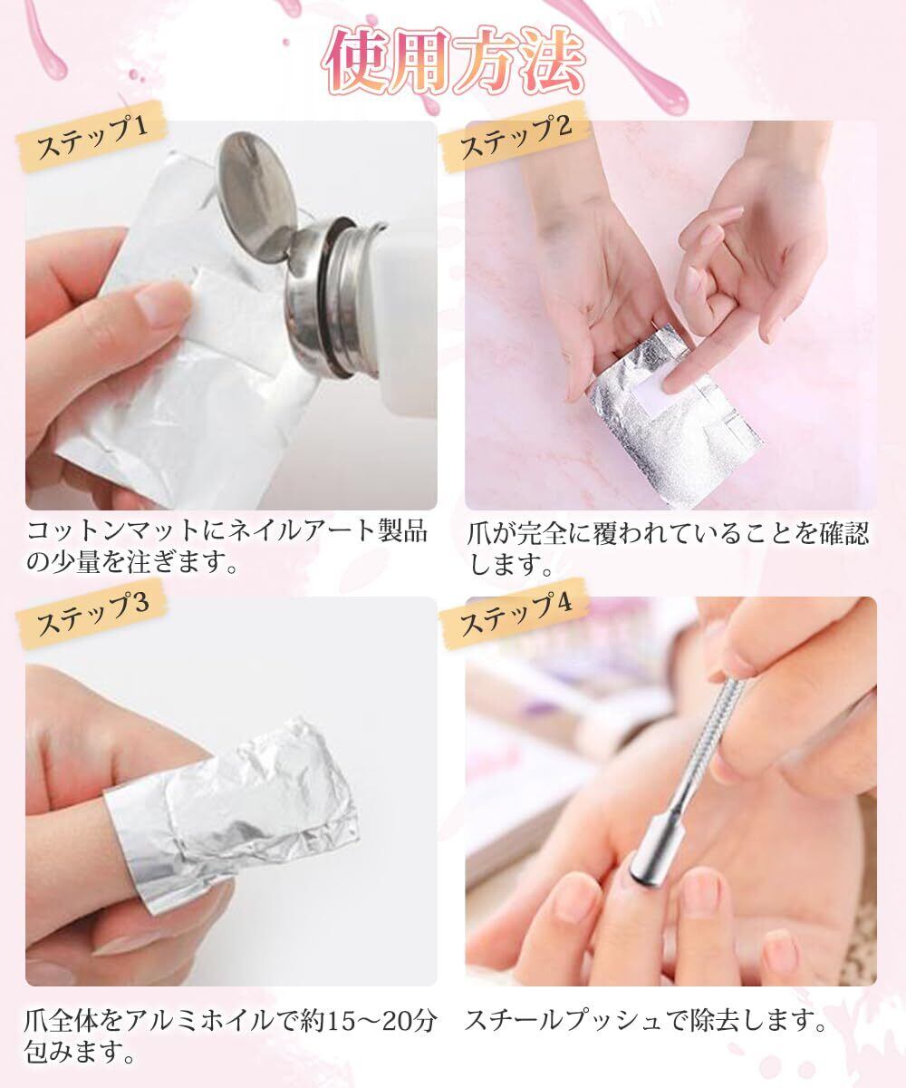 【使いやすさ】ネイルポリッシュリムーバーをコットンパッドに注ぎ、アルミホイルでしっかりと指に巻き付け、10〜15分待ってから慎重にアルミホイルを取り外し、スチールプッシャーで除去します。