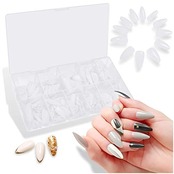 【サイズ別分け】10種類のチップはセット付きのボックスの中で分類されていて、混ざりにくいです。つけ爪自体は半透明の白なので、色んパーツや柄で自由にネイルチップをデコレーションする。