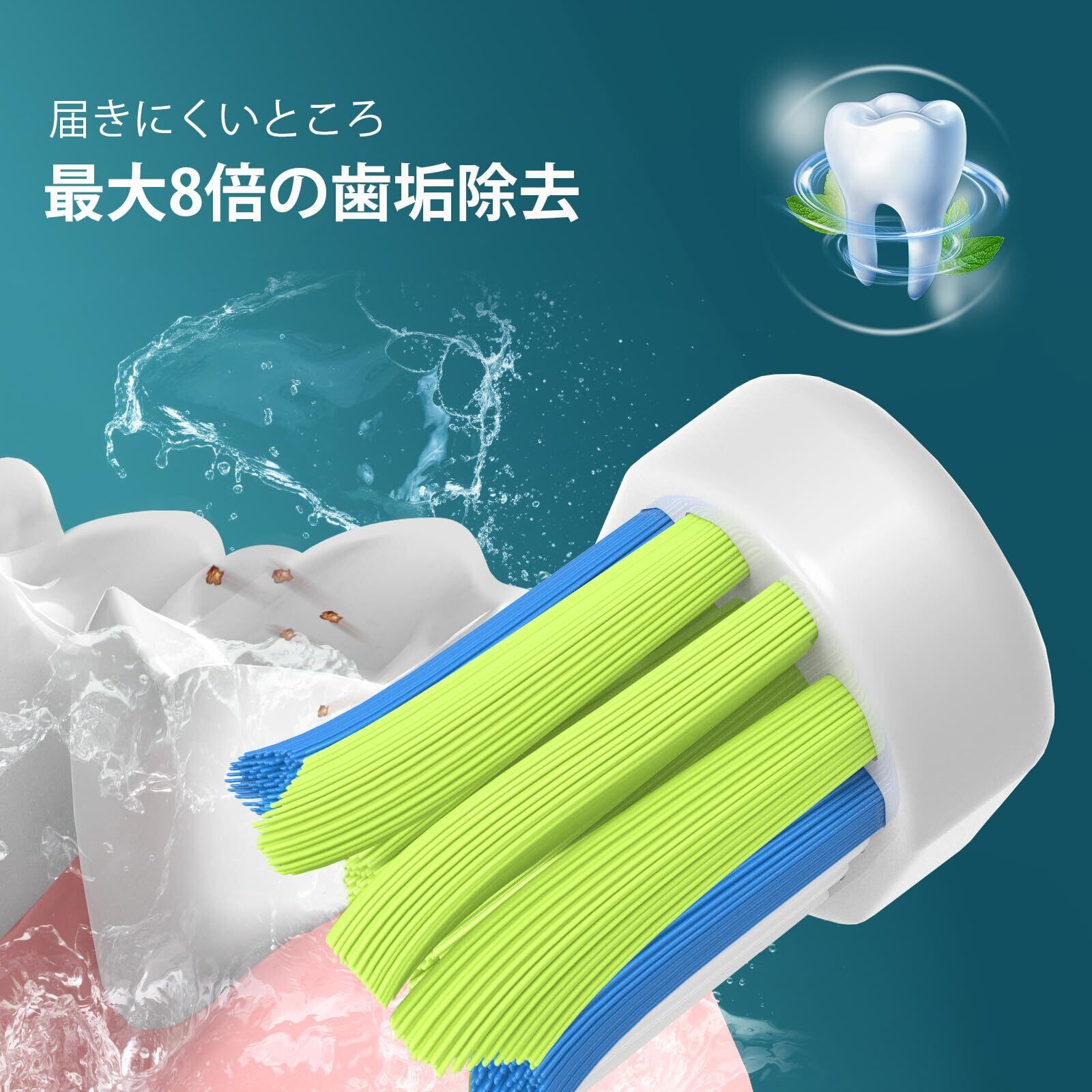 【手動歯ブラシより8倍の歯垢除去】ブラッシング接触面積を最大化にして、密集した毛先のステイン除去パッドが、表面の8倍の歯垢を簡単に取り除きるだけなく、波状な毛先デザインで、歯に完璧にフィットし、歯間部にも届きやすく、効果的に歯間の歯垢除去ができます。