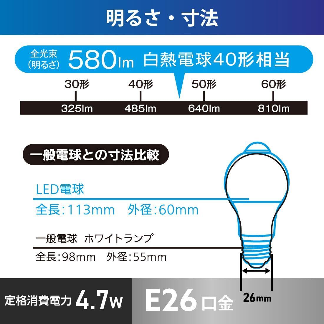【 仕 様 】 ◆寸法:全長…113mm、最大径…60mm ◆質量:48g ◆定格消費電力:4.7W ◆待機消費電力:0.1W ◆全光束:580 lm ◆エネルギー消費効率:123.4 lm/W ◆平均演色評価数:Ra83 ◆定格寿命:40000h※ 屋内用(屋外使用禁止)※ 交流電源 100V 50/60Hz 共用