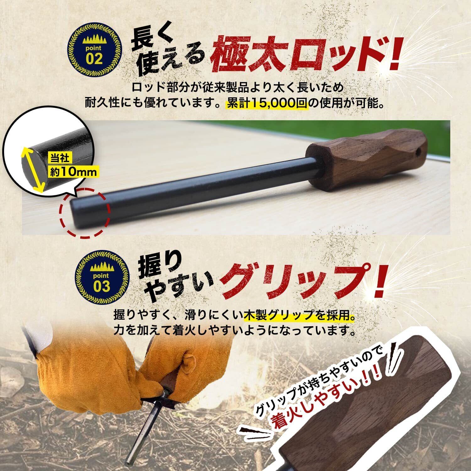 【握りやすい木製グリップ】握りやすく滑りにくい木製グリップを採用することで力を加えやすくなり、着火しやすいようになっています。