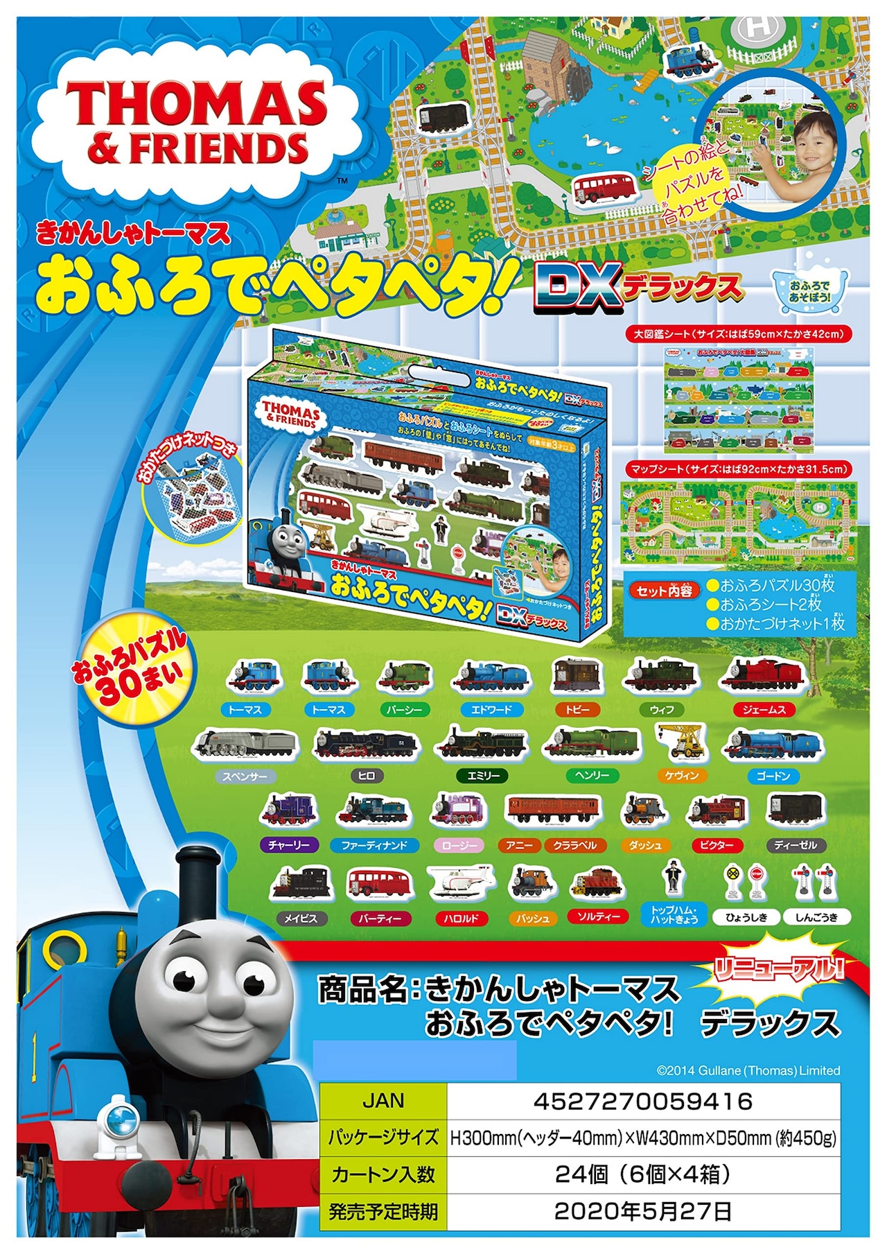 きかんしゃトーマスのおふろ遊びセットです。トーマスと仲間たちが、お風呂の壁にくっつきます!ビッグサイズのおふろシートにパズルをはって遊べます。おかたづけネットがあるので、お片付けも簡単!お風呂がもっと楽しくなるよ。パッケージサイズ:約180x50x40mm