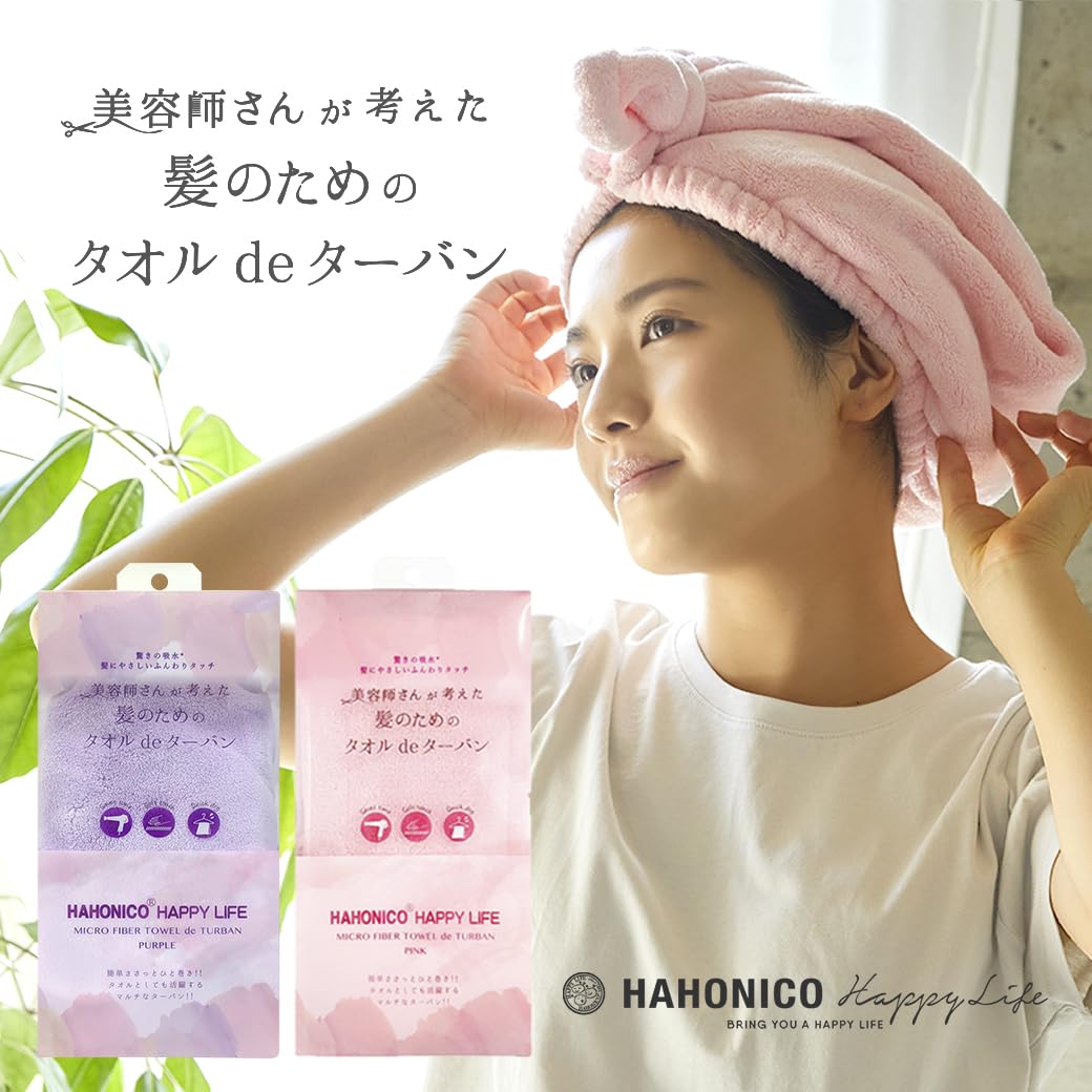 美容師さんが考えた髪のためのタオルと同じ生地を使用しており、極細繊維のマイクロファイバーがしっかり水分を吸水します。パイルカット仕様なので肌触りがよく、髪の毛にも優しい触感。取付ボタンにはスナップボタンを採用し、ゴム紐で取り付けるヘアタオルに比べゴムの劣化がないのも嬉しいポイント。広げて使えばタオルのように使え、頭に巻くときには素早く簡単に装着できます。吸水・速乾・軽量でタオルとターバンの2WAY仕様。伸縮性のあるフリーサイズ。