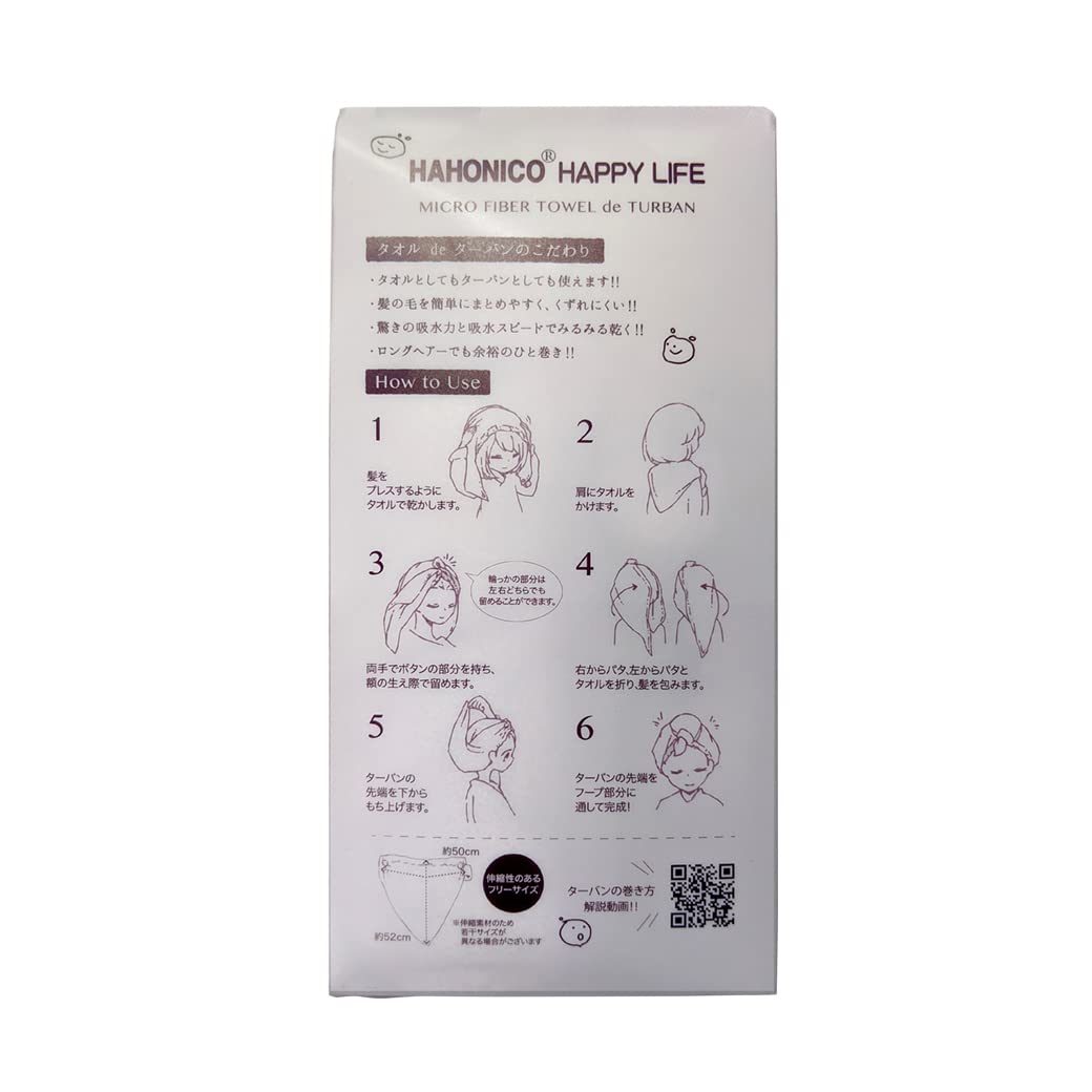 【使い方】1.髪をプレスするようにタオルで乾かします。 2.肩にタオルをかけます。 3.両手でボタンの部分を持ち、額の生え際で止めます。 4.右からパタ、左からパタっとタオルを折り、髪を包みます。 5.ターバンの先端を下から持ち上げます。 6.ターバンの先端をフープ(輪っか)部分にとおして完成。