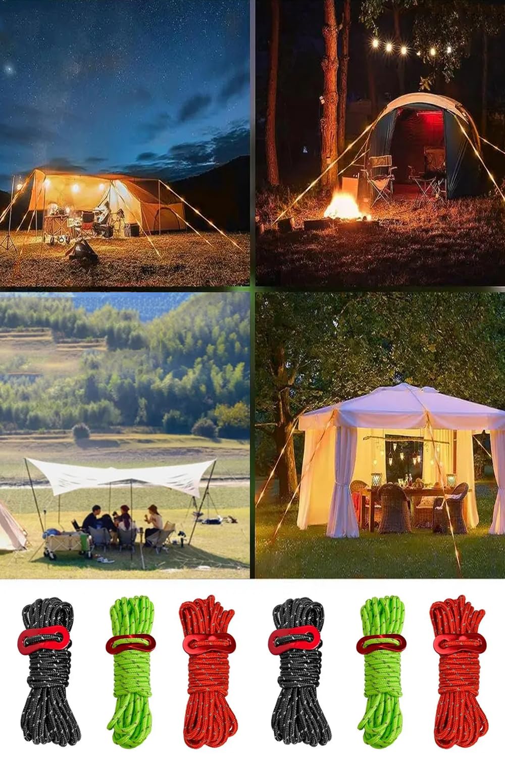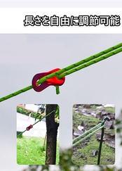 【目立つ】ガイロープは高品質の耐久性に優れた材質で作られています、ロープは2本の反射材入りワイヤーが編み込まれています。夜間の視認に効果的な反射素材入りテントロープで、昼間でもしっかり目立つようベースカラーは蛍光色となっております。