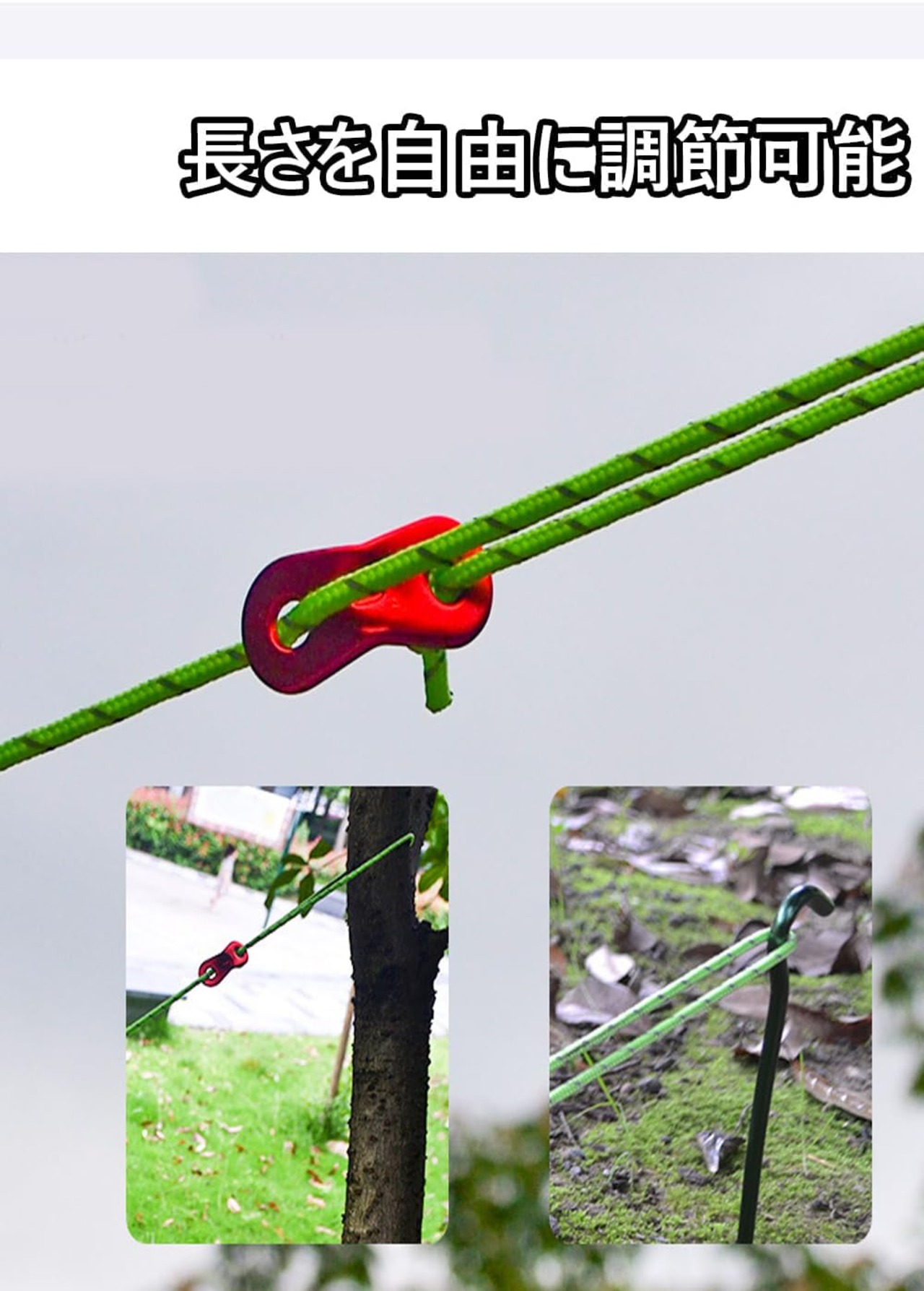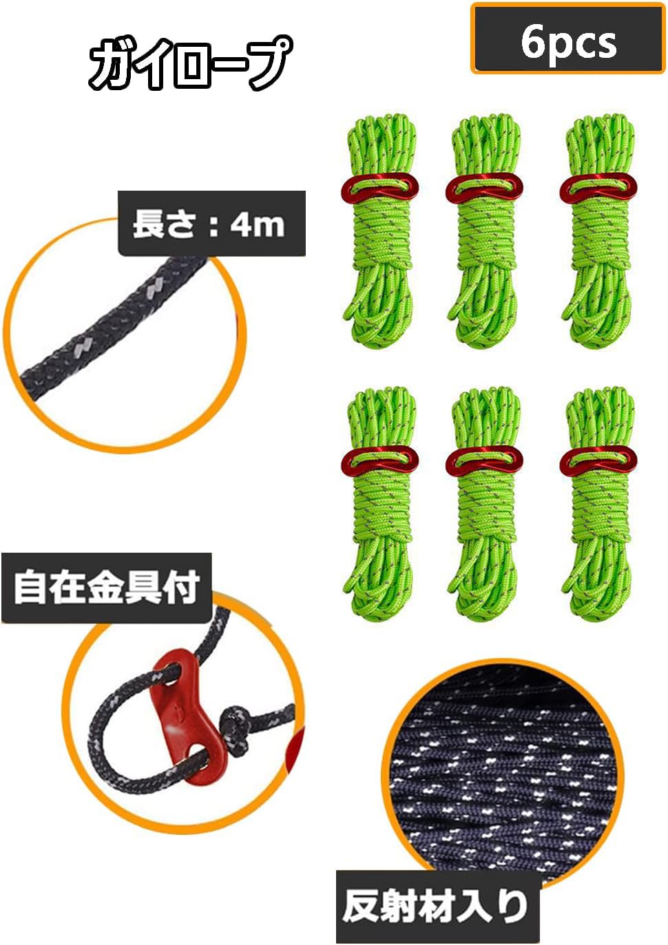 【セット内容】4mm * 4mのロープ ×6本、アルミニウム製自在金具*6。 【ガイロープ】径が4mmなので、しっかりしている、200kgまでの荷重に耐えられます。材質:内側がポリプロピレン、外側がポリエステル、反射材入り。 【目立つ】ガイロープは高品質の耐久性に優れた材質で作られています、ロープは2本の反射材入りワイヤーが編み込まれています。夜間の視認に効果的な反射素材入りテントロープで、昼間でもしっかり目立つようベースカラーは蛍光色となっております。 【長さを自由に調節可能】ロープの長さを調整しやすいアルミ合金の調整バックルを装備し、ロープの接続と長さの調整に広く使用され、簡単で丈夫。 【多用途】キャンプだけでなく、アウトドアとレジャー以外でも何かと使えるロープで、たとえばジッパープルコード、キャリーバッグプルコード、ハンモックロープ、テントロープ、衣服ライン、ギア用の交換コードなど。