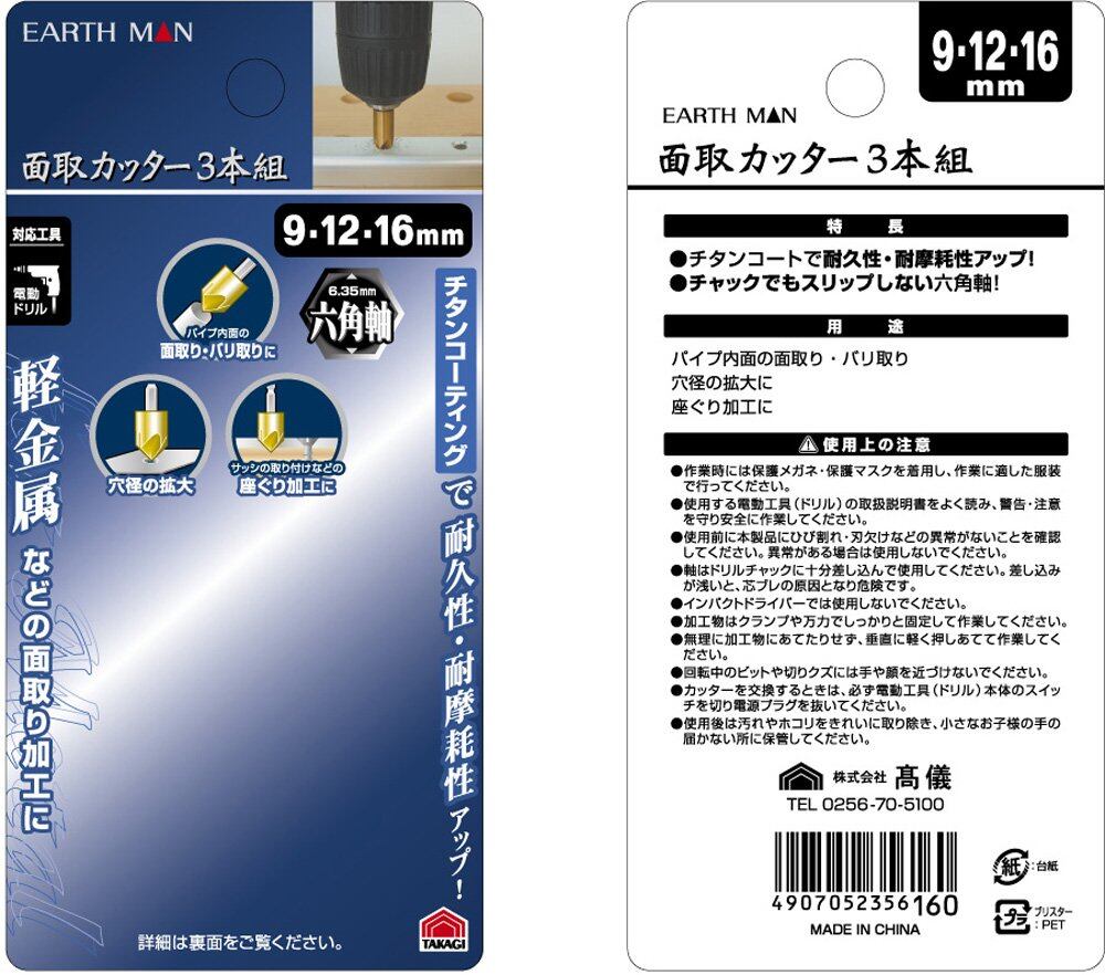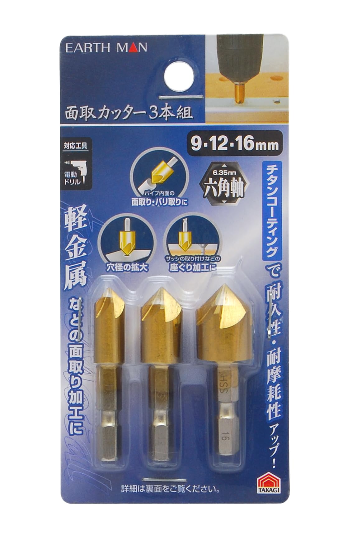 高儀(Takagi) EARTH MAN 面取カッター 3本組 9・12・16mm チタンコーティング 耐久性 耐摩耗性 4907052356160