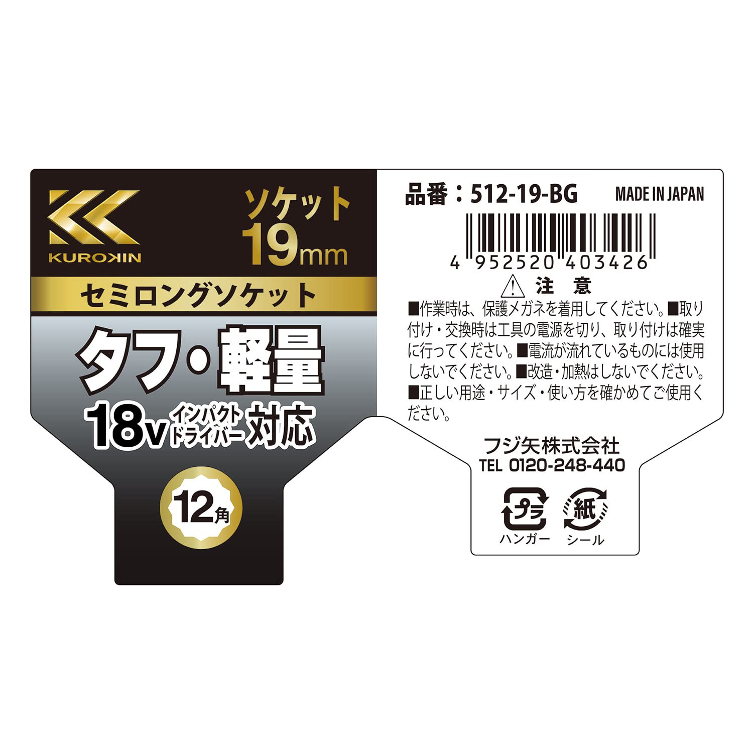 フジ矢 セミロングソケット タフ・軽量 12角 19mm 黒金 512-19-BG