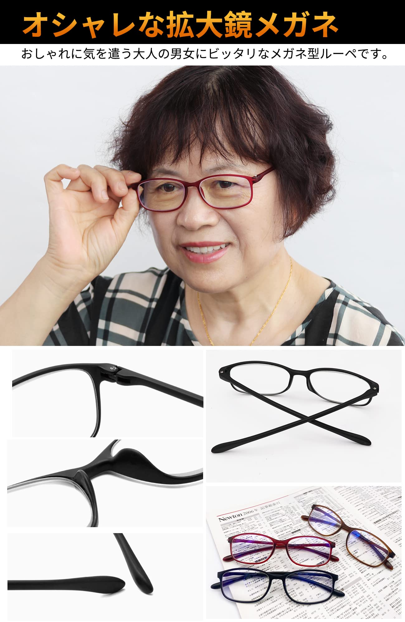 ??【充実の7点セット】・拡大鏡メガネ ・めがねハードケース ・メガネストラップ ・収納ポーチ ・滑り止めイヤーフック ・レンズ清潔用クロス ・3WAYミニドライバー 附属品は最初から全部揃っているからお手入れが楽々です。★丈夫なヒンジを使用、何度開閉しても壊れない、緩くなってきても、付属のダライバーですぐに調節可能です。 読書・ネイルケアなど細かい作業・スマートフォンの細かい文字を読むなど日常の様々な用途にお使いいただけます。母の日、父の日、敬老の日などの贈り物に高齢者の方もスマートフォンやタブレットを使う時代なのでこの拡大鏡めがねをプレゼントすると大変喜ばれます。