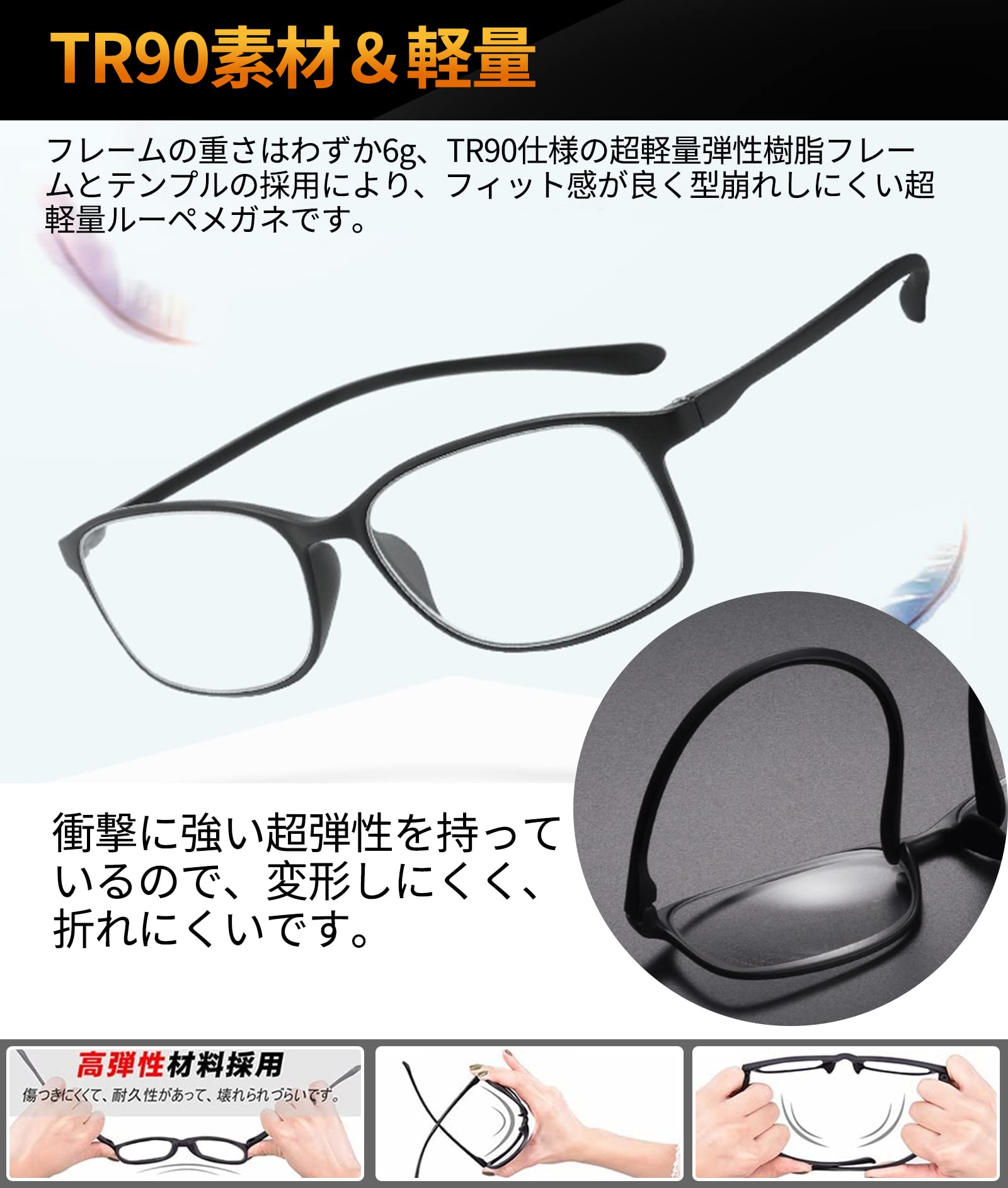 ??【超軽量弾力樹脂素材TR-90使用】フレームの重さはわずか7.5g、折れないTR90仕様の超軽量弾性樹脂フレームとテンプルの採用により、とても軽量で、弾力性を持ち衝撃に強く、変形しにくく、折れにくいなどの特徴があります。フィット感が良く型崩れしにくい超軽量眼鏡型ルーペです。しなやかなTR90製フレームは、少々曲げても折れることなく、顔をやさしくホールドし長時間でも快適にかけられます。柔軟に広がるのでスムーズにかけ外しできます。