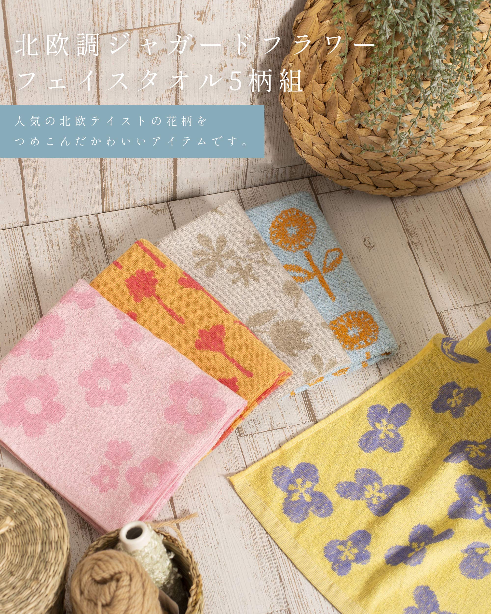 Kosugizen フェイスタオル 北欧調ジャガード フラワー 5色(5柄)各1枚入 34×80㎝ 北欧風モチーフ 乾きやすい薄手タイプ 5枚セット SV-2308-5
