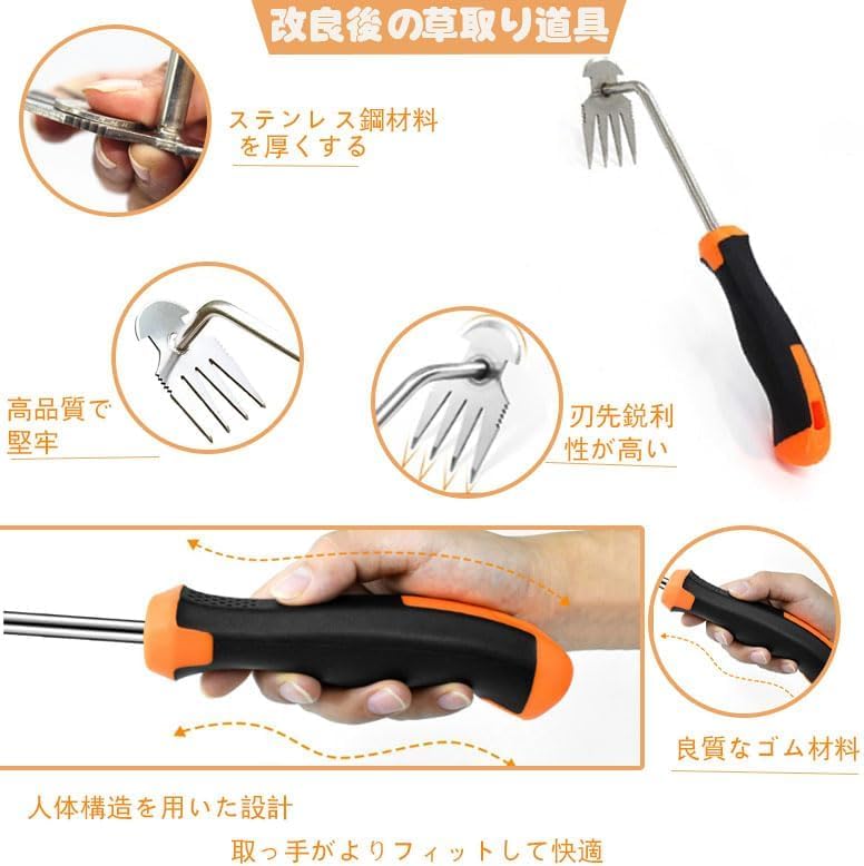 【簡単な除草】このツールは、狭くて手の届きにくい場所の雑草を取り除くのに役立ちます。 4本の鋭い歯を草の根元近くの土に押し込んで引っ張るだけです。また、土の表面を砕いて排水を良くします。非常に使いやすく効率的です。