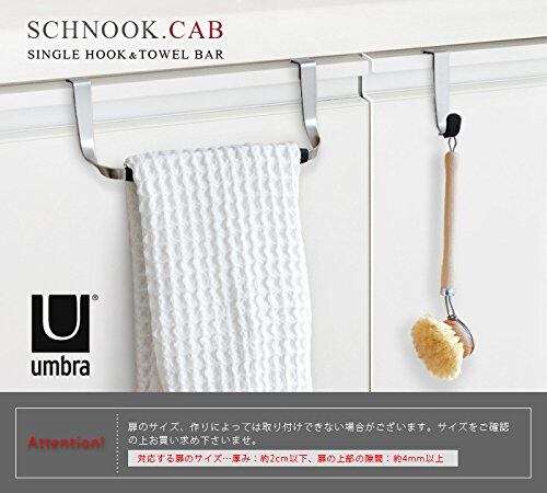 シンク回りや洗面所でタオル掛けや袋掛けが無くて困った事はありませんか? またタオルで手を拭いた後に、タオルが滑り落ちてそれを掛けなおして…面倒に思った事はありませんか? Umbraのスックヌック キャブ シングルフックはそんな問題を解決!。 シンク下や洗面所下の収納扉に引っかけるだけで簡単にタオルや袋が掛けられます。 タオルを掛ける部分はラバーで覆われているのでそれが滑り止めになり、手を拭いた後に簡単にタオルが落ちてしまう事もありません。 扉に引っかける部分の裏側には保護用のラバーを貼ってあるので、扉を傷つける事もありません。 このUmbraのスックヌック キャブ シングルフックなら、タオルが滑り落ちて掛けなおして…といったストレスなく使うことができます。 ◆用途:シンク下や洗面下の収納扉用のドア用フックでキッチンタオルや袋を掛けられる ◆簡単に設置: スックヌック キャブ シングルフックはシンクの下の扉に引っかけるだけで簡単に設置が可能 ◆機能的:タオルを掛ける部分にラバーが付いているのでタオルで手を拭いた後にタオルが滑り落ちにくい ◆保護:扉に引っかける部分の接地部分にはラバーが貼ってあり扉を傷つけない デザイン:UMBRA DESIGN GROUP Umbraについて:世界的なプロダクトデザイン会社で、オリジナル、モダン、カジュアル、機能的で手ごろな価格のデザイン製品をご自宅に提供します。UMBRA DESIGN GROUPデザイン。 ※厚さ約2cm未満、上部の隙間約4mm以上の扉に対応。 サイズ: W1.2×D5(フック部分を含む)×H8cm 素材: スチール、ラバー 原産国: 中国
