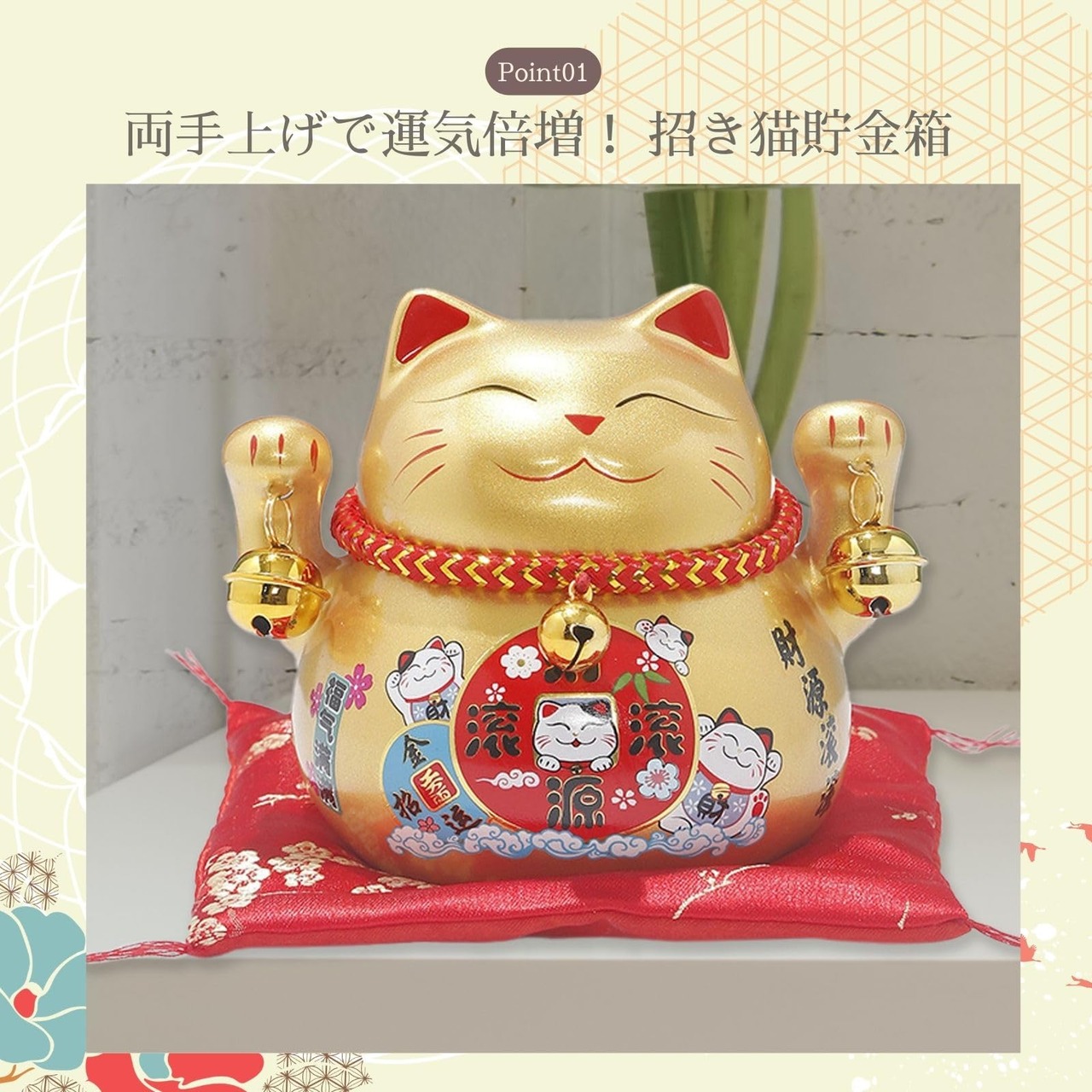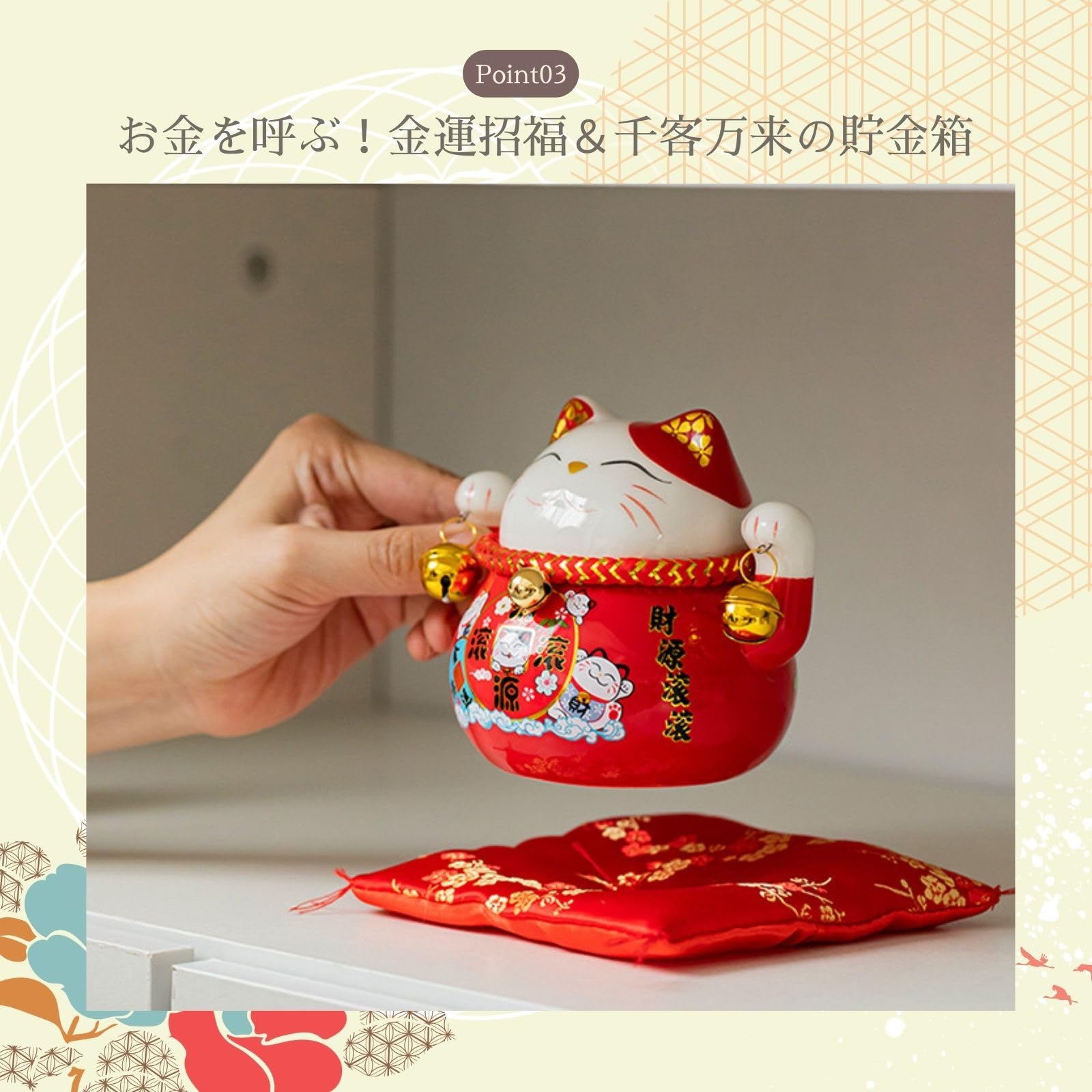 金運アップのサポート:金運アップのご利益を授けてくれる招き猫の貯金箱にお金を貯めれば、お金がお金を呼ぶように次々とあなたに思わぬお金が舞い込みます。底部には取り出し口があり、取り出しも簡単です。