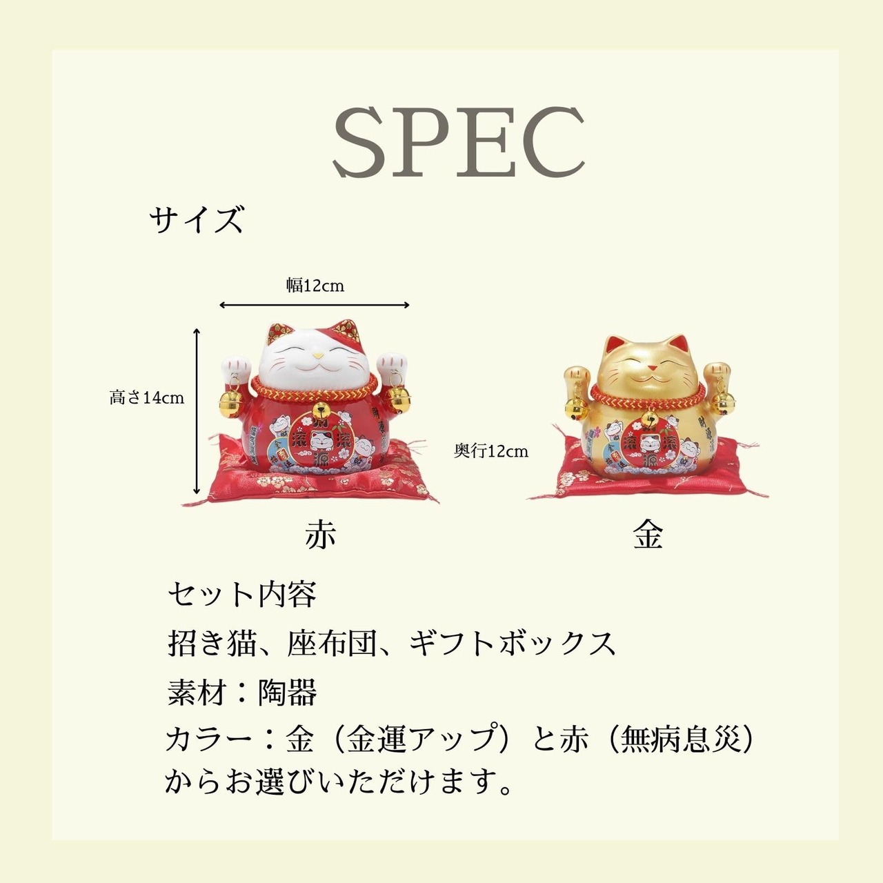 セット内容:招き猫、座布団、ギフトボックス・サイズ:幅12cm 奥行12cm 高さ14cm 素材:陶器 カラーはゴールドとレッドから選べます。まねき猫 置物のセットには、座布団付きで玄関やリビングにもぴったりの飾り物です。