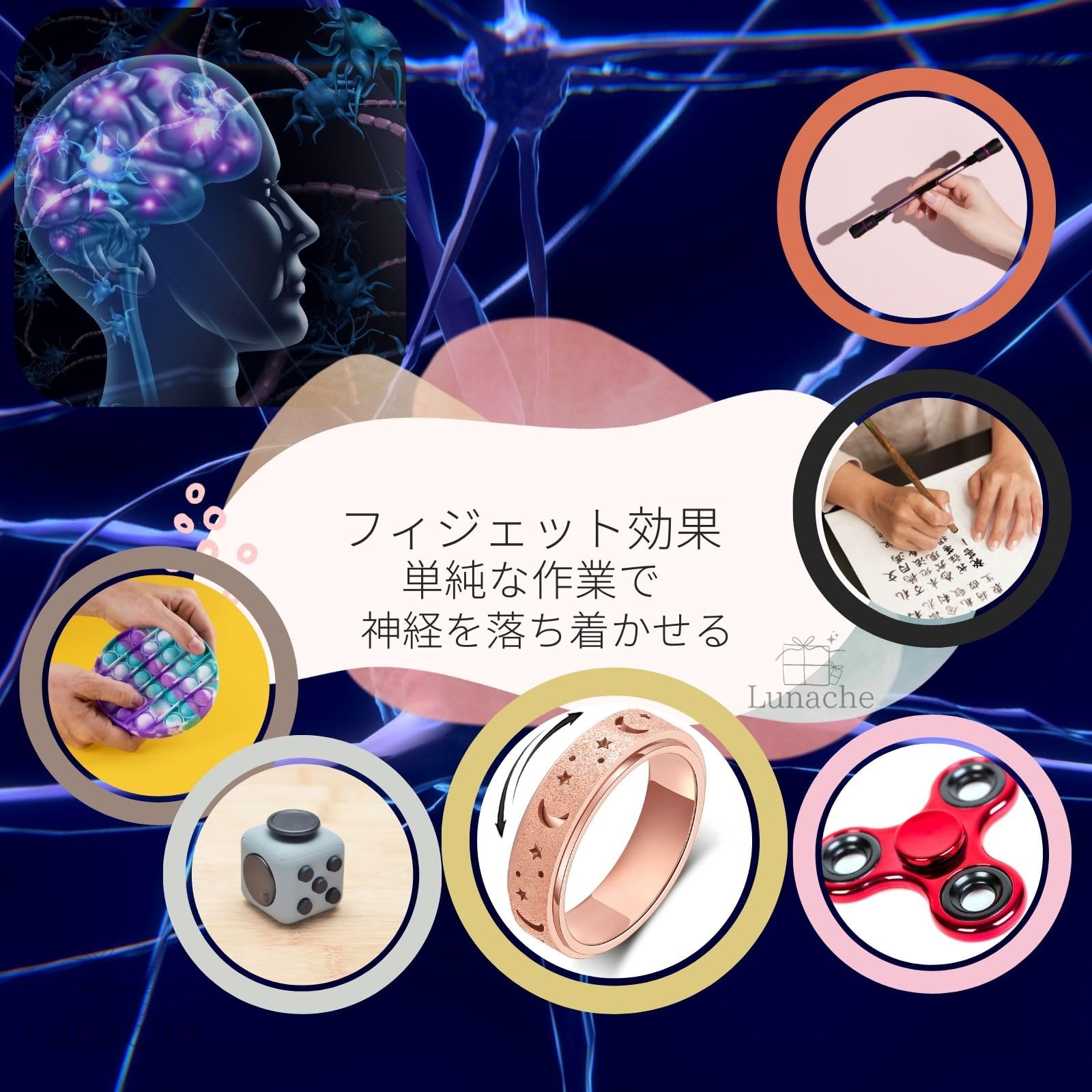 リング部分がスムーズに回転することで、手の動きに集中させ、不安や心配事を一時的に忘れられる効果があります。イライラ感を和らげ、落ち着きを取り戻すサポートをします。