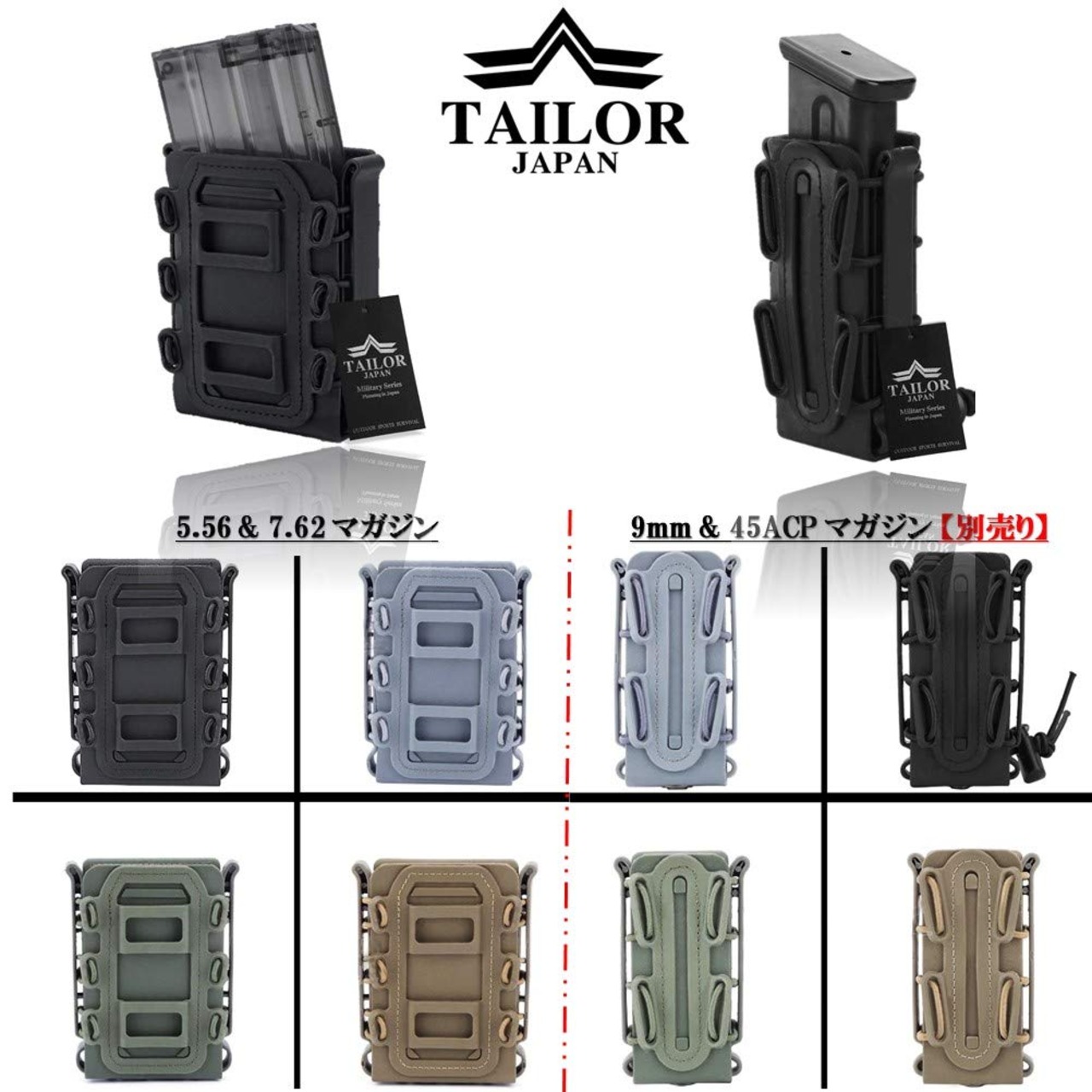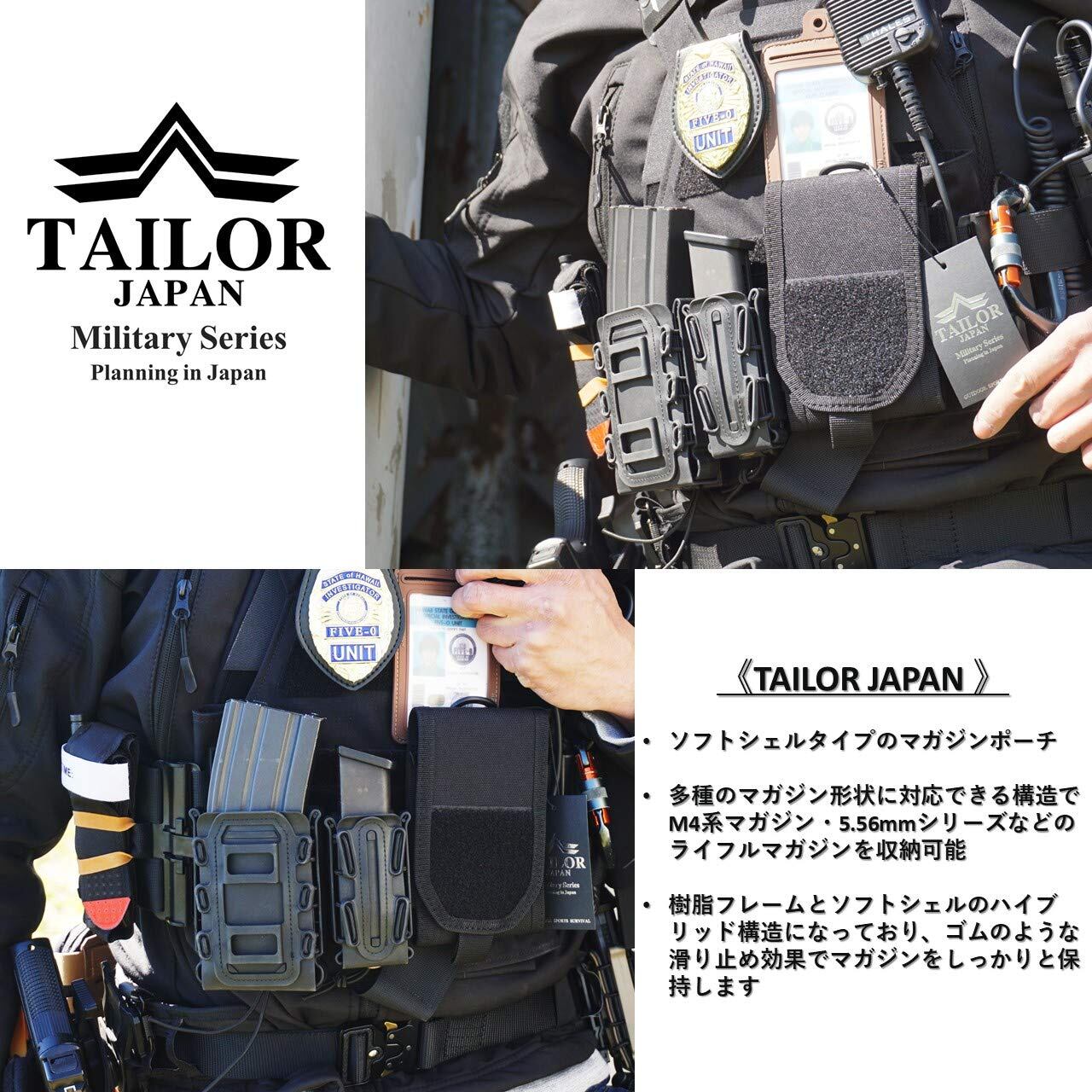 【仕様①】 TAILOR JAPAN ソフトシェルタイプのマガジンポーチ。 多種のマガジン形状に対応できる構造で5.56mmや7.62mm、M4・AK・ライフルのマガジンをはじめ様々なアイテムが収納可能。