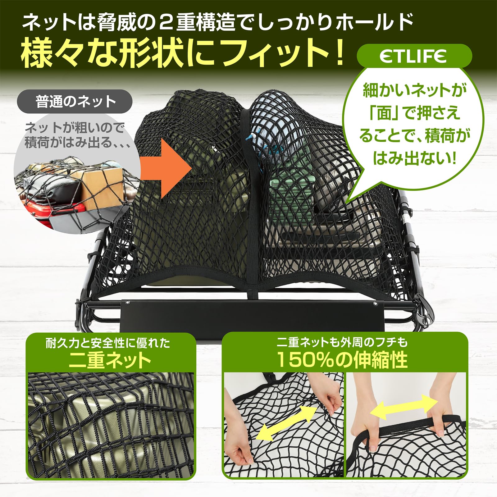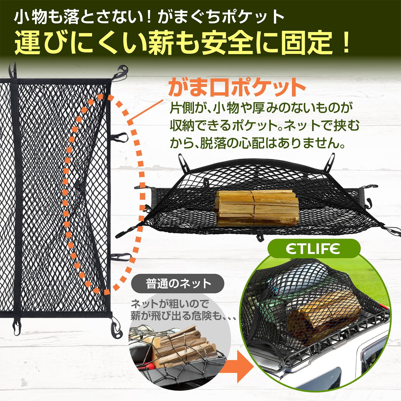 【人気】ETLIFE カーゴネット 車 90×120cm 2重【キャンプインストラクター監修 簡単設置で時短!絡まない!】ABS製フック×12 ステンレス製カラビナ×12 収納ポーチ付属 ルーフラック ネット ルーフネット ラゲッジネット ルーフキャリア 荷崩れ防止 | GIGATERA
