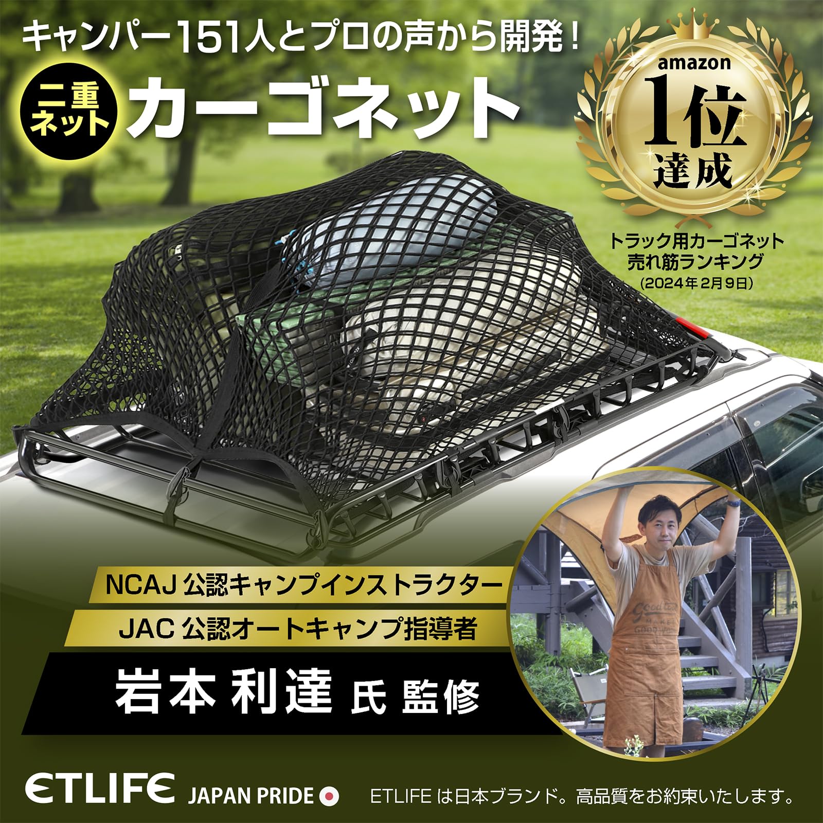 ? キャンプインストラクター監修 : 151名のキャンパーとキャンプインストラクターの要望を全て叶えた決定版 カーゴネット です。サイズ:90cm×120cm 目の細かさ 3cm×4cm