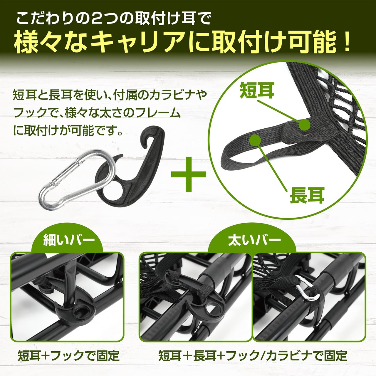 ? 様々なキャリアに対応 : フックだけで無く、独自の取り付け方法を採用しました。キャリアバーの太さによらずに装着することができます。
