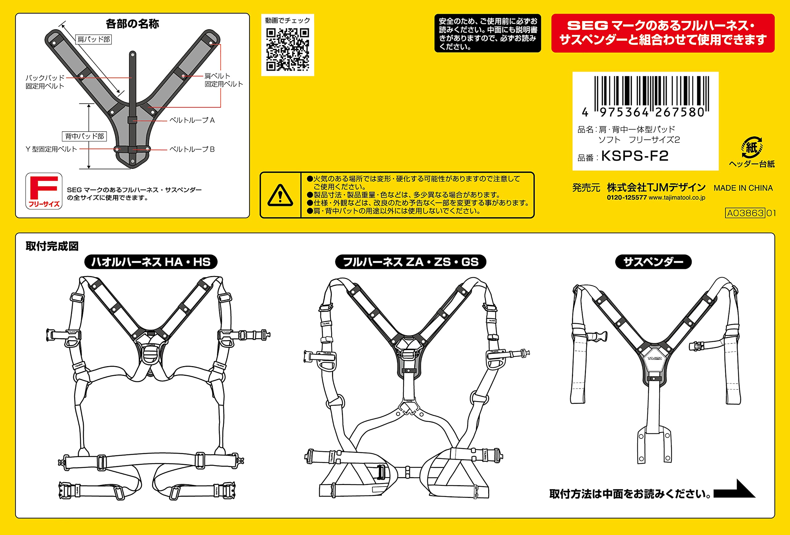 TJMデザイン(TJM Design) タジマ 安全帯フルハーネス・サスペンダー用 肩・背中一体型パッド しなやかに体にフィットするソフトクッション X型・Y型ハーネスのどちらにも使える フリーサイズ KSPS-F2