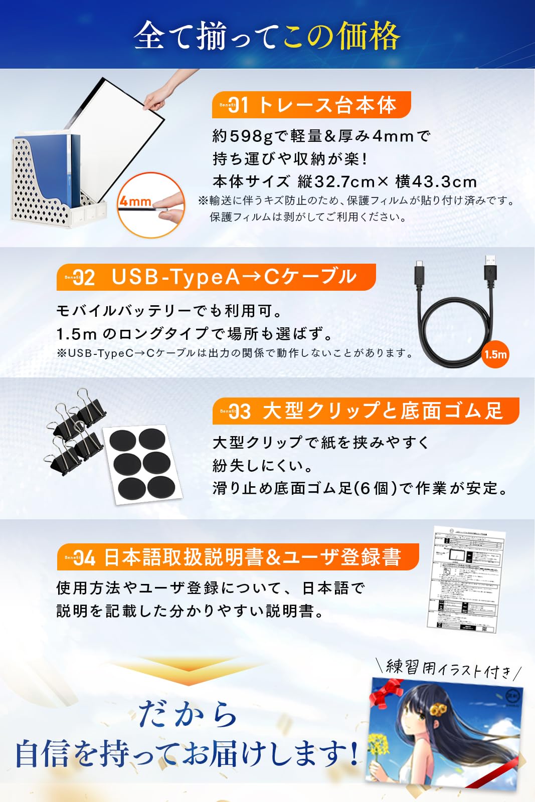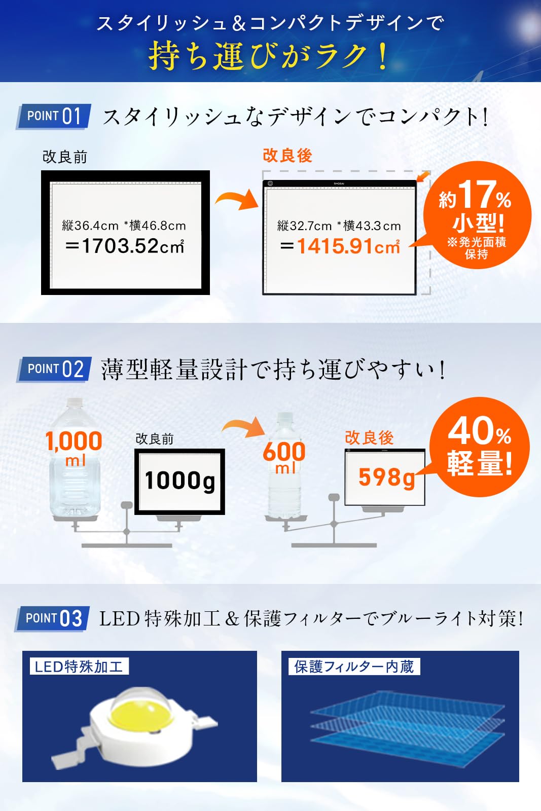 【軽量コンパクト設計】 従来の発光面サイズは保持し、限界まで 軽量 コンパクト 化を行いました。厚さ 4mm 重さは 598g 程度です。プロのイラストレータ様に推薦いただいており、自信を持って商品をお届けします■パネルは高品質なものを採用し明るくみやすいので スクリーントーン トレース作業 イラスト作成 製図 写し絵 に最適です