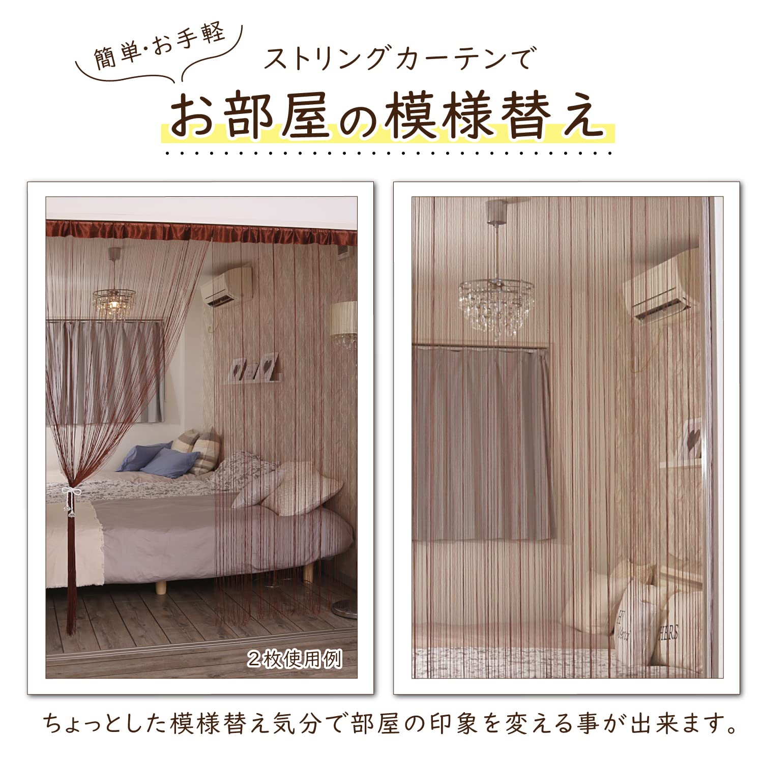 【透け感のある糸カーテン】:透け感があり圧迫感を抑えて空間を仕切れるストリングカーテン。