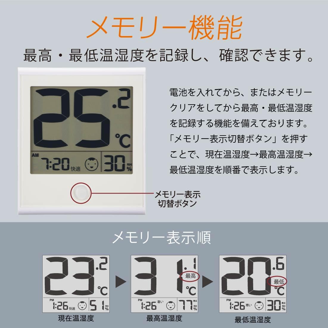 【 特 長 】 ◆冷暖房の温度調整による節電や、熱中症・風邪対策の健康管理に役立ちます ◆見やすい大画面表示 ◆最高・最低温湿度を表示するメモリー機能付き ◆快適表示機能付き ◆カレンダー表示・時計機能付き ◆置き掛け両用 ◆本体カラーはホワイト