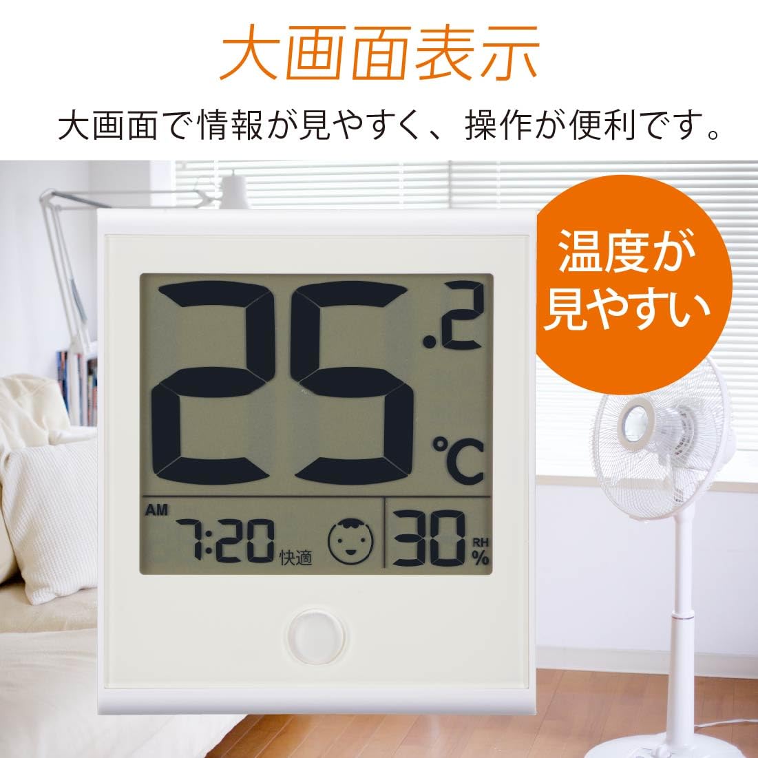 オーム電機 温度計 大文字 温湿度計 温度が見やすい温湿度計 大画面 置き形 壁掛け 時計 カレンダー 時刻 日付 快適表示 ホワイト TEM-200B-W 08-1442 OHM