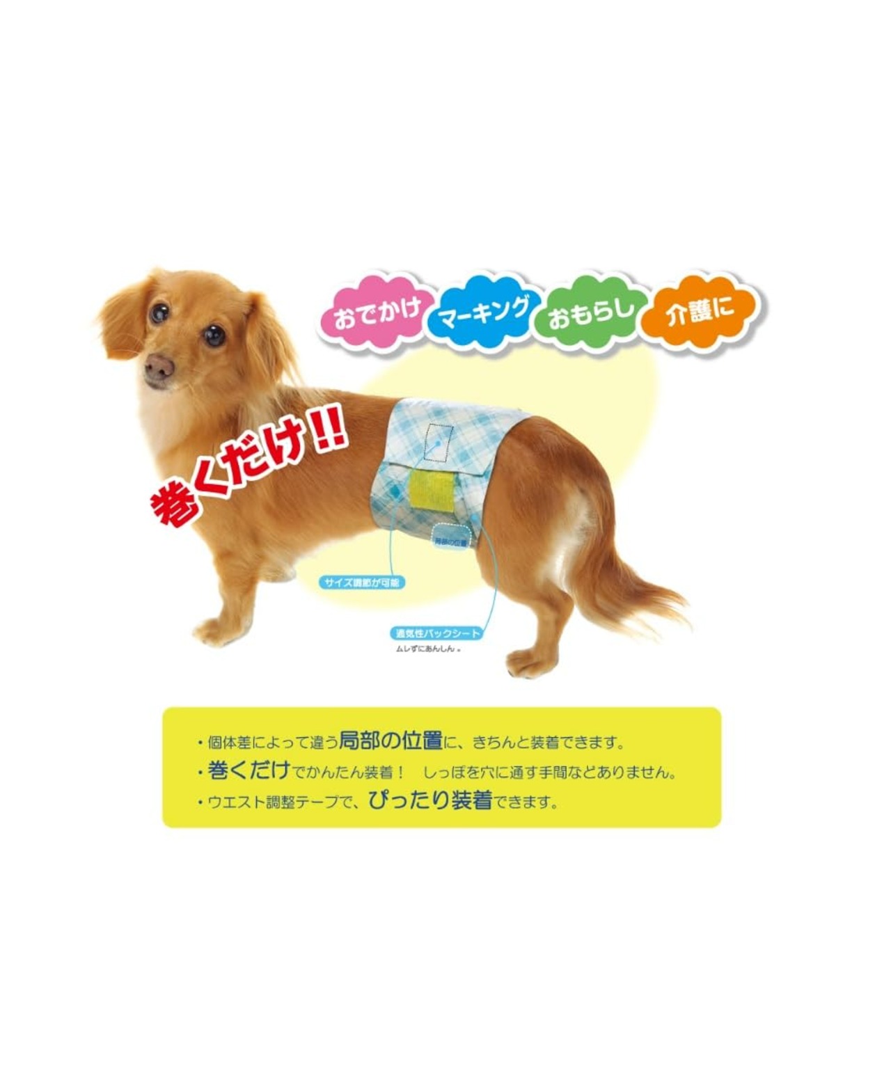 男の子専用の巻くだけ簡単、ペット用紙おむつです。おしっこストップポケットで前とび防止。ギャザー間も広がり吸収面積UPでより安心。さらに吸収面積が広がり吸収量UP。新波型ストライプシートで吸収スピードUPで逆戻り極小。