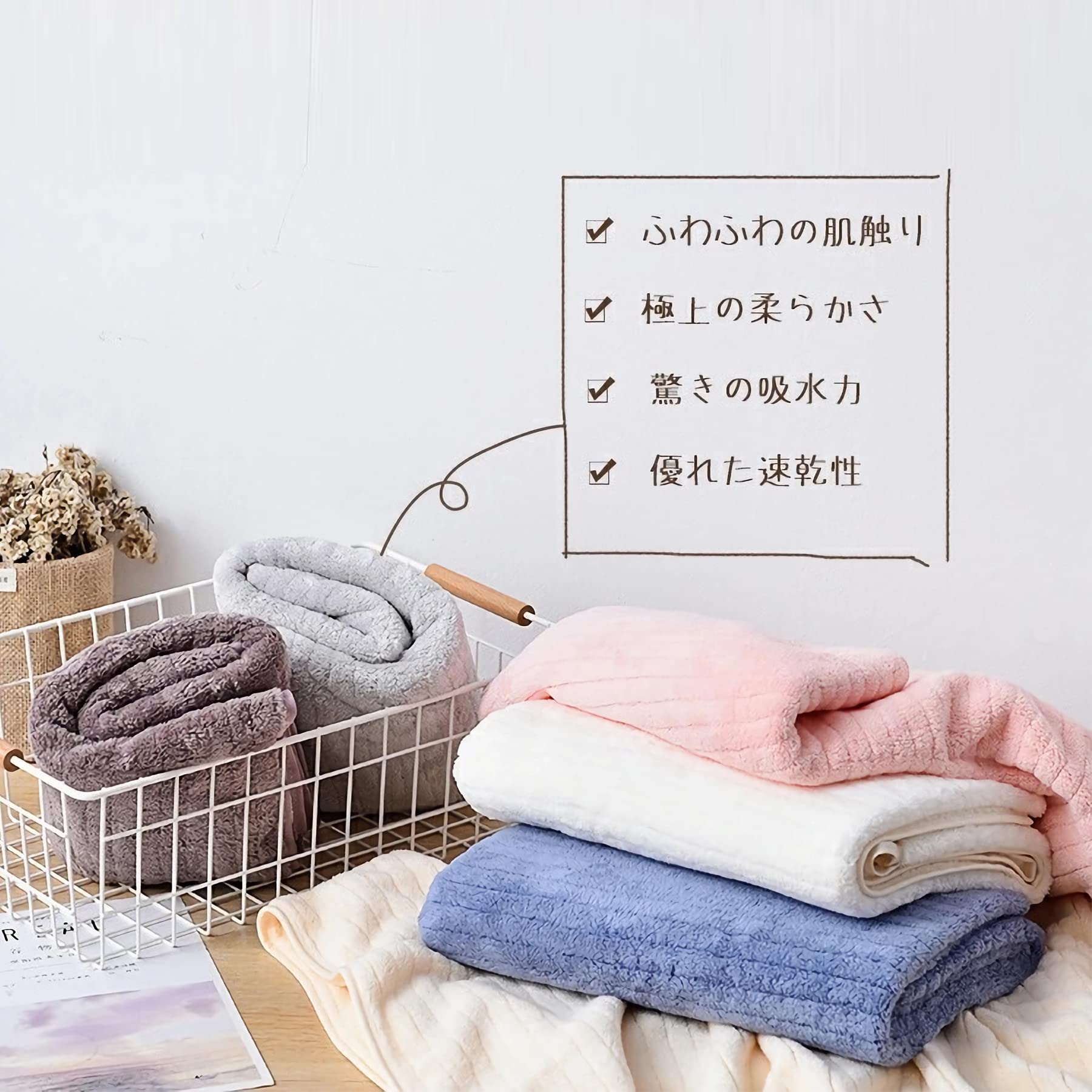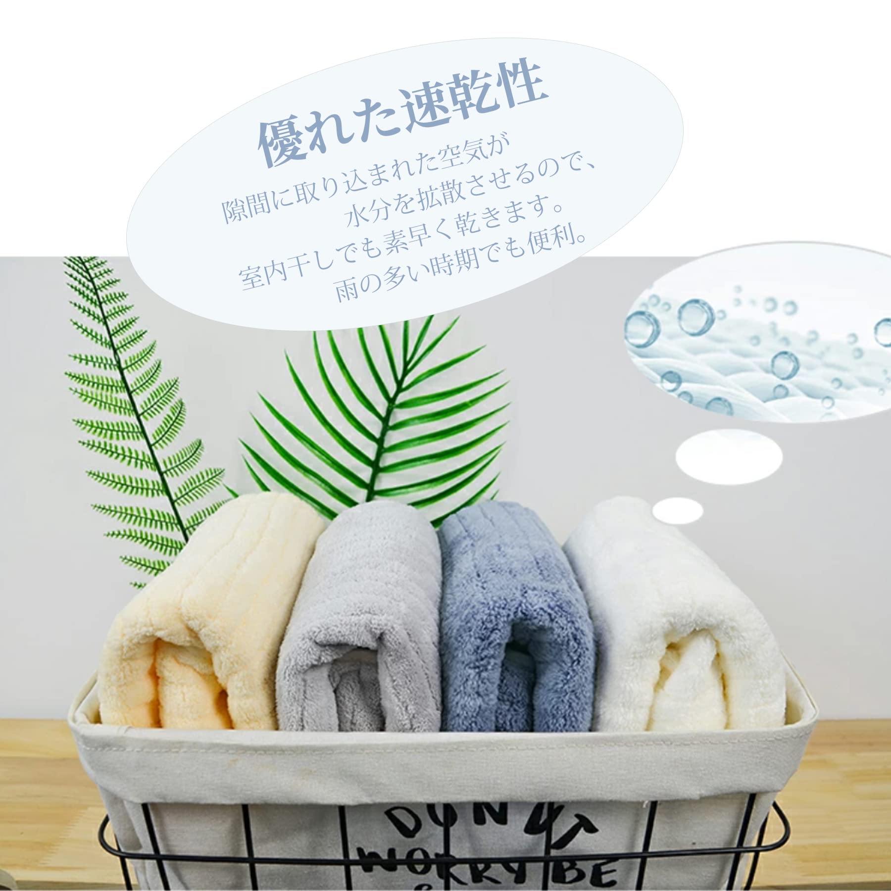 【優れた吸水性と速乾性】綿素材より優れた吸水性と速乾性。 マイクロファイバー素材の表面には無数の隙間があり、その隙間に大量の水を素早く吸収します。 髪や肌を軽く拭くだけで水分を吸収し、ホコリがつきにくいです。 バスタオルの隙間により、隙間に溜まった水分を空気が素早く拡散させるので、乾燥が早く、無菌で衛生的な状態を保つことができます。 梅雨や湿気の多い季節でも清潔を保ちます。 乾きにくい洗濯物にも快適にお使いいただけます。 室内干しも可能です。