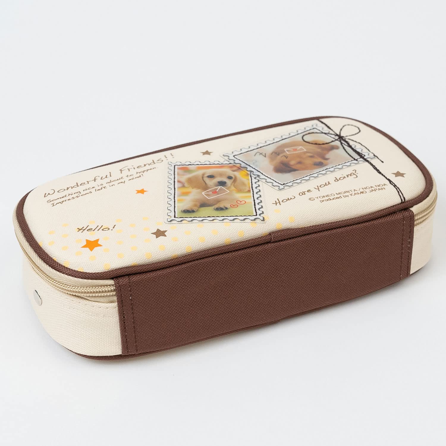 落ち着いたナチュラルテイストの裁縫バッグ。 切手になった子犬ちゃんを 包み込むような立体感のある 結び目がキュートなソーイングセット。