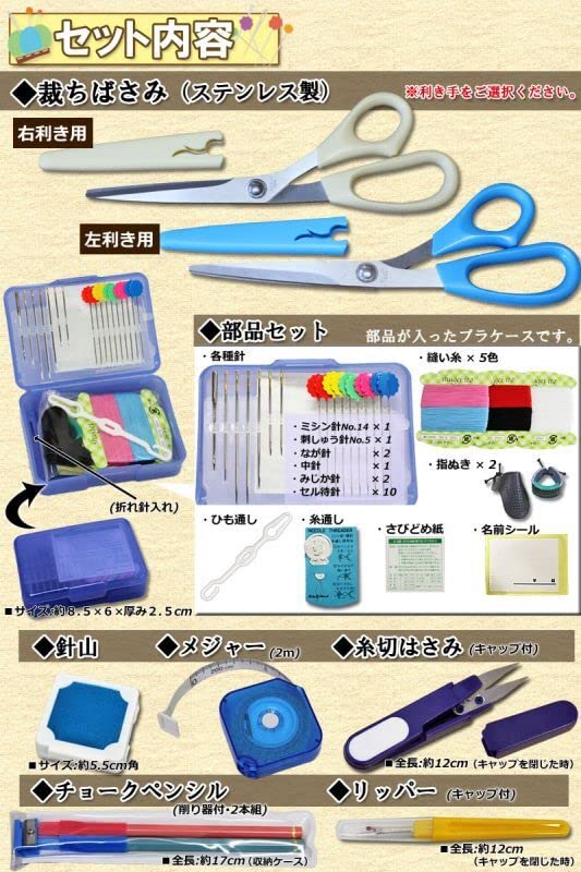 ●ケース入り針山 ●裁ちばさみ:1本(全長:21cm) ※裁ちばさみの利き手をお選び下さい。 ●リッパー ●チャコペンシル2本組(削り器付) ●自動巻きメジャー2m ●糸切りはさみ:1本(全長約11.5cm) ※時期により仕様が変わる可能性があります