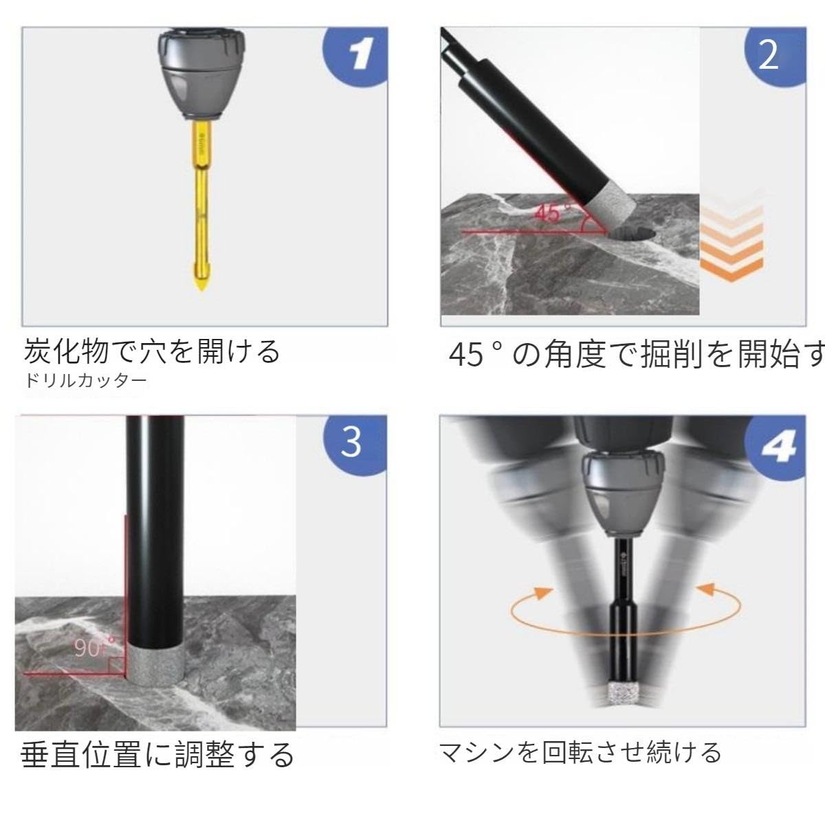 最初に45°斜角に位置して、垂直に穴を開けます(回転速度があまり速くないことに注意して、ゆっくり操作して800~1000回転程度にしてください。