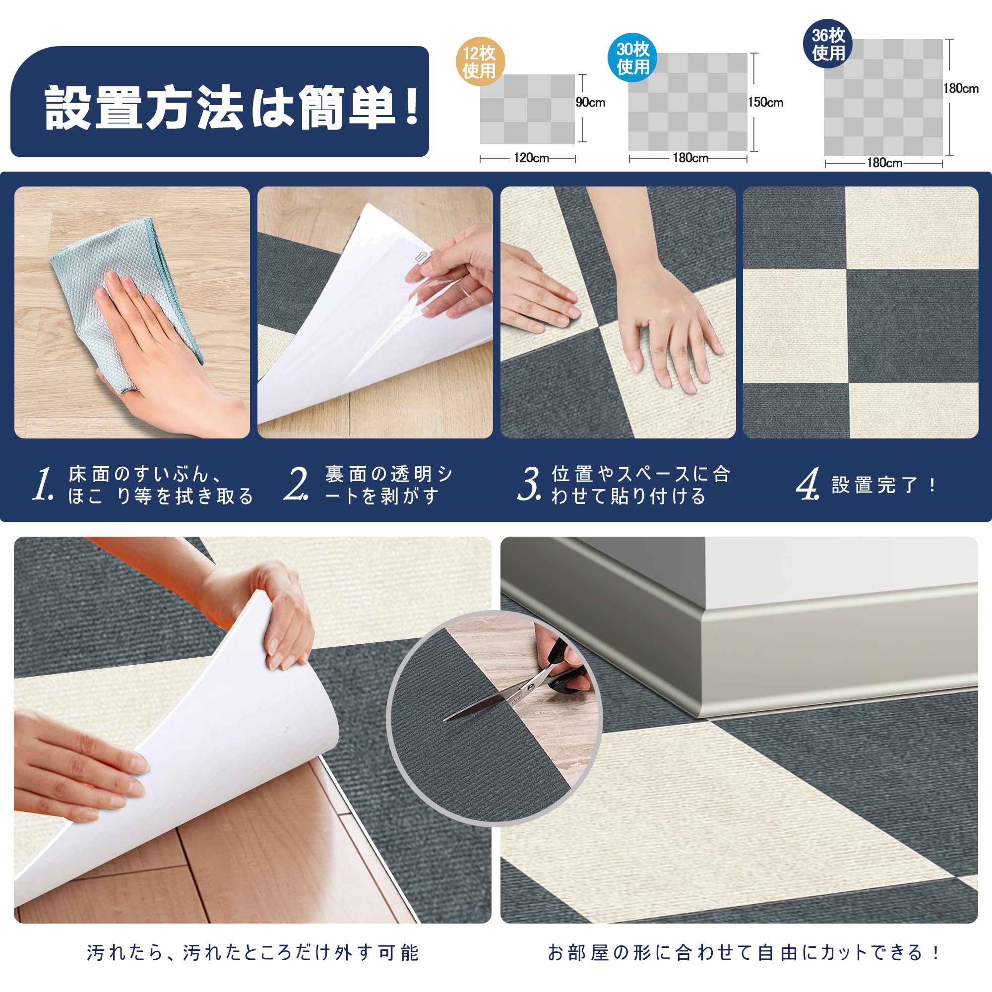 ??【水洗い対応】掃除機やロボット掃除機にも対応しているのでお手入れ簡単。汚れたり破損したりした場合は汚れた部分だけ取り外して、手洗い・スポンジなどを使うとさらに効果的です。(洗濯機使用を勧めません)。 お掃除もラクラク、軽く洗濯すれば、繰り返しお使いいただけます。 床の傷、汚れ防止にぴったりで、簡単にお部屋のイメージを変えることができます。