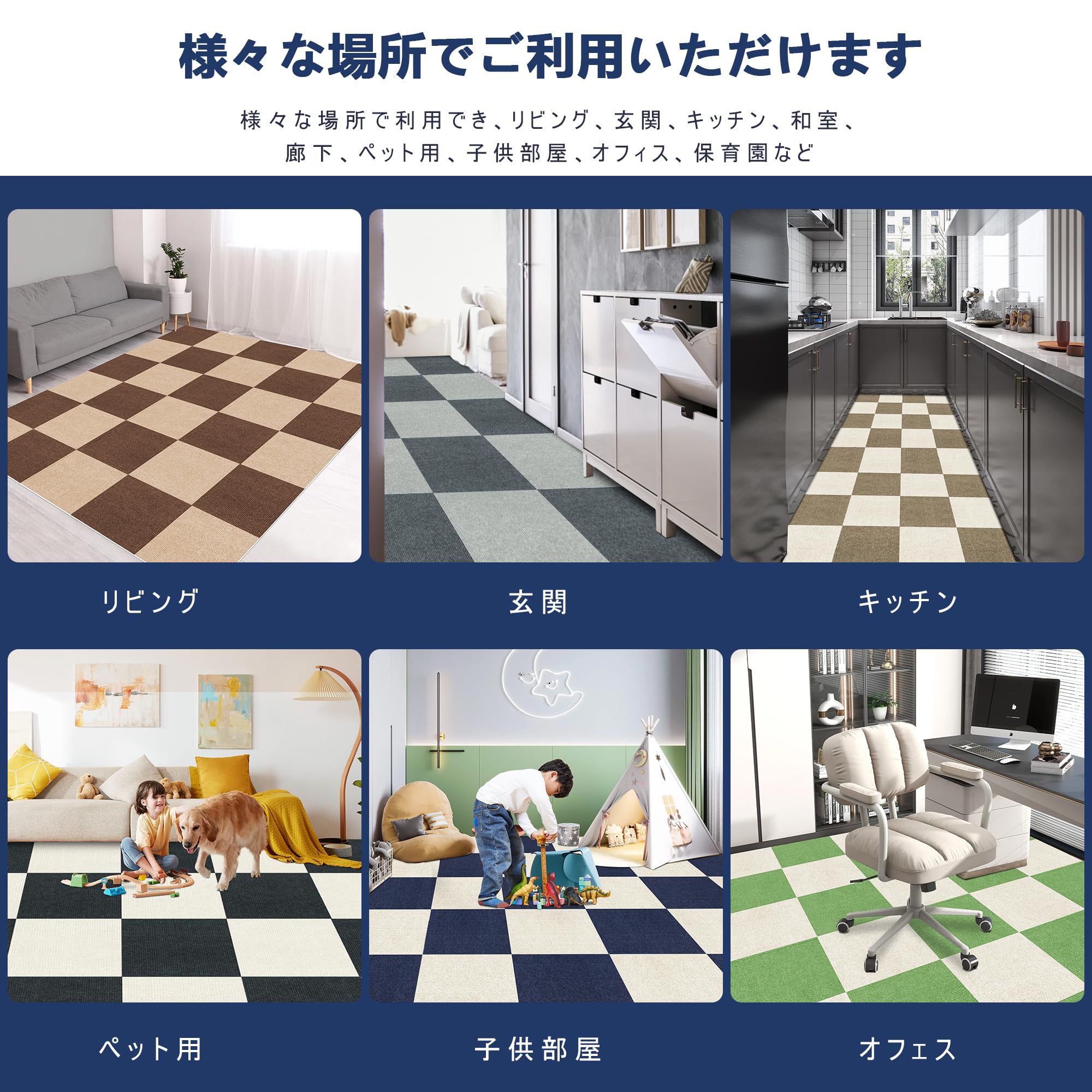 ??【床暖房にも対応&幅広く応用】 床暖房の上でも敷いていただくことが出来るの寒い冬もあったかく過ごせます。お部屋のサイズ、形状に合わせてぴったりと敷きこむことも可能です。さらに、ハサミを使って簡単にカスタマイズができ、部屋の隅や壁際などの場所でもぴったり敷き詰めることができます。様々な色バリエーションがあり、ご自身の好みに合わせて自由に組み合わせましょう。リビングでのカーペット、厨房での滑り止めマット、玄関での汚れ防止マットや廊下の防音マット、いろんな場所で様々な役割で使用できます。