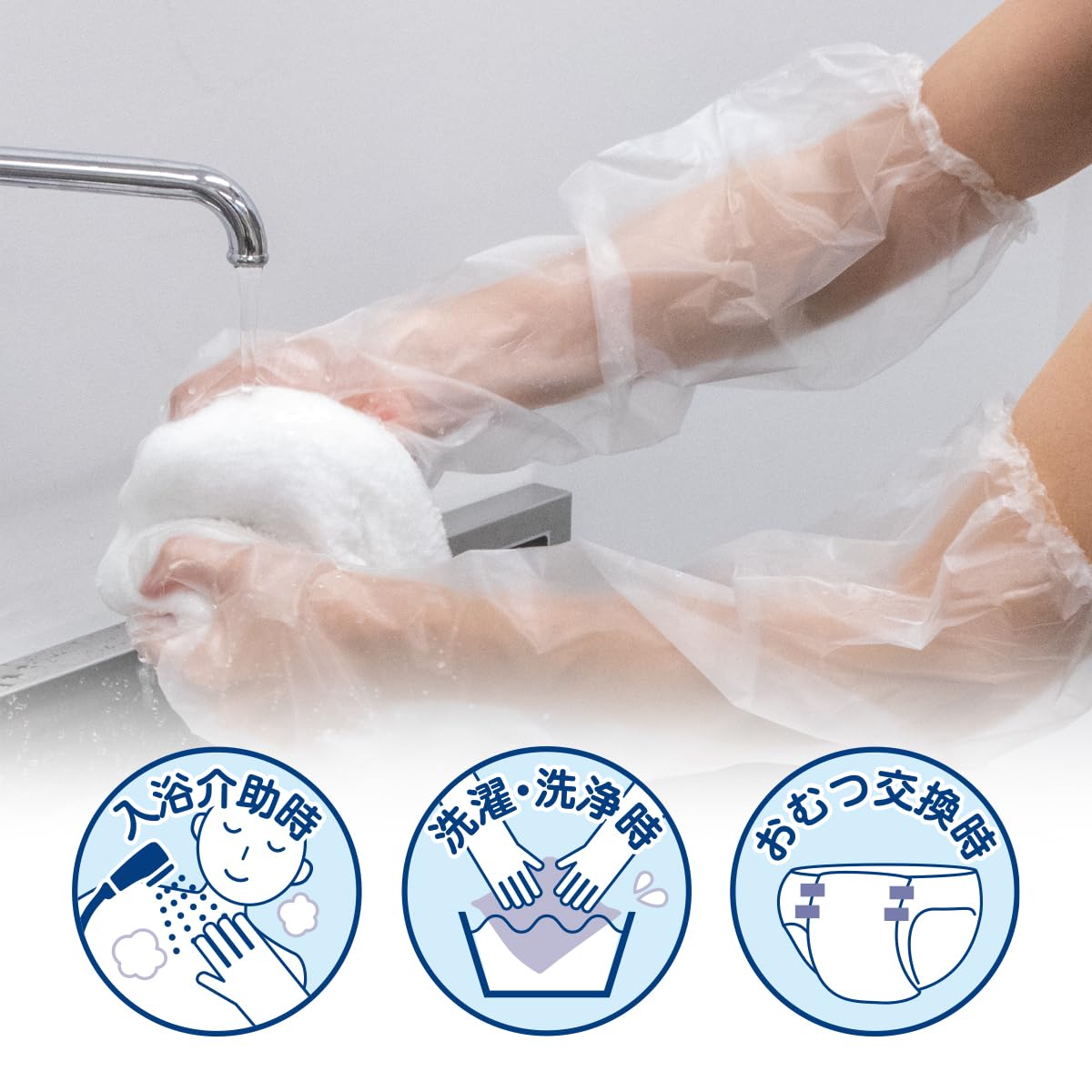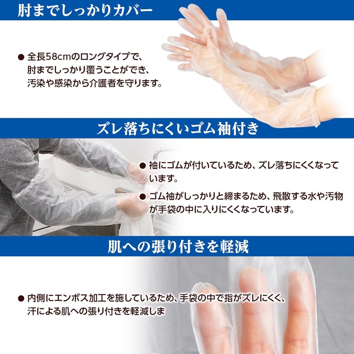 ●肘までしっかり覆うことができ、汚染や感染から介護者を守ります。