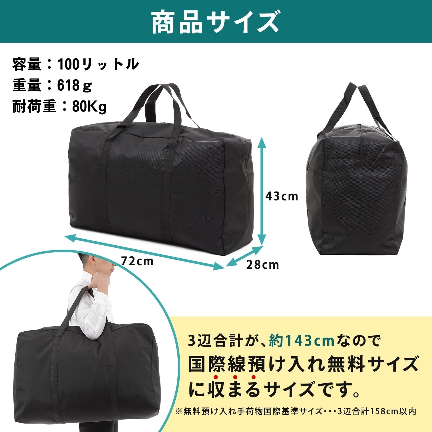 【サイズなど】 サイズ:横幅72㎝ x 高さ43㎝ x マチ28㎝。 重量:約618g。 容量:100リットル。 素材:表地420Dナイロンオックスフォード地 裏地ハイパロンコーティング加工。 国内線/国際線において預け入れ手荷物できるサイズです。