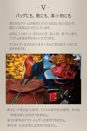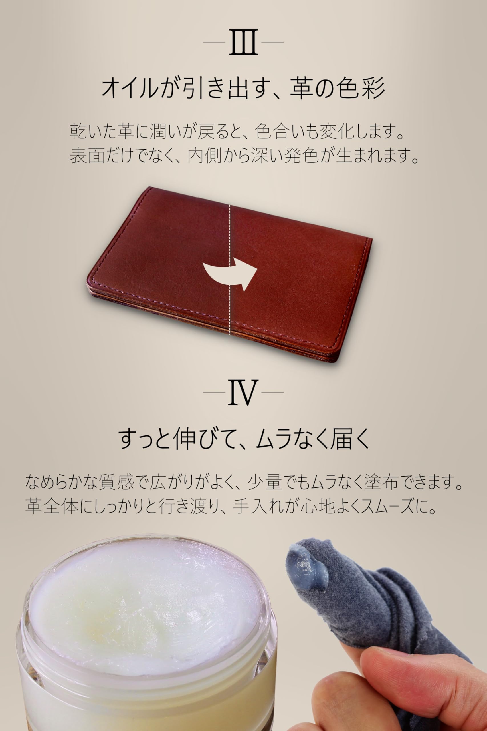 ●皮革に新しいオイルを加えて、柔らかさと、なめらかさを保つ