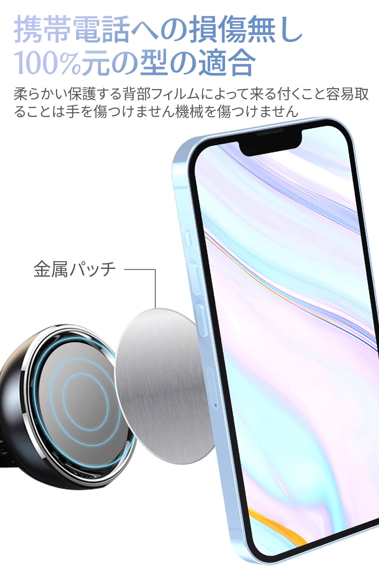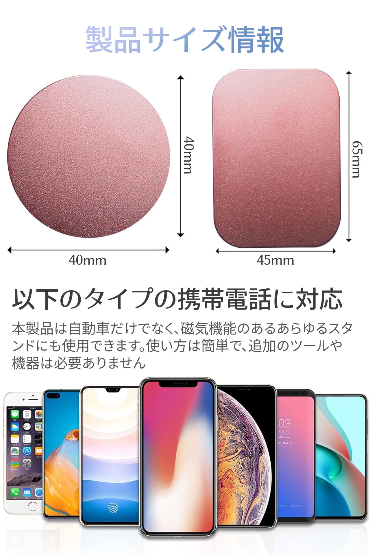 【サイズ・仕様】丸型メタルプレート:直径42mm、厚さ0.5mm;角型メタルプレート:45.5mm*65.5mm、厚さ0.5mm。 ほぼすべての4.2-5.6インチのスマートフォンに対応。