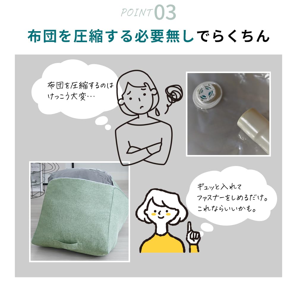 <おすすめポイント>・お布団や洋服を収納してクッションにできる収納ケース。・クッションとして使えるので収納スペースを作らなくても大丈夫!・かさばる布団をコンパクトに収納できます。