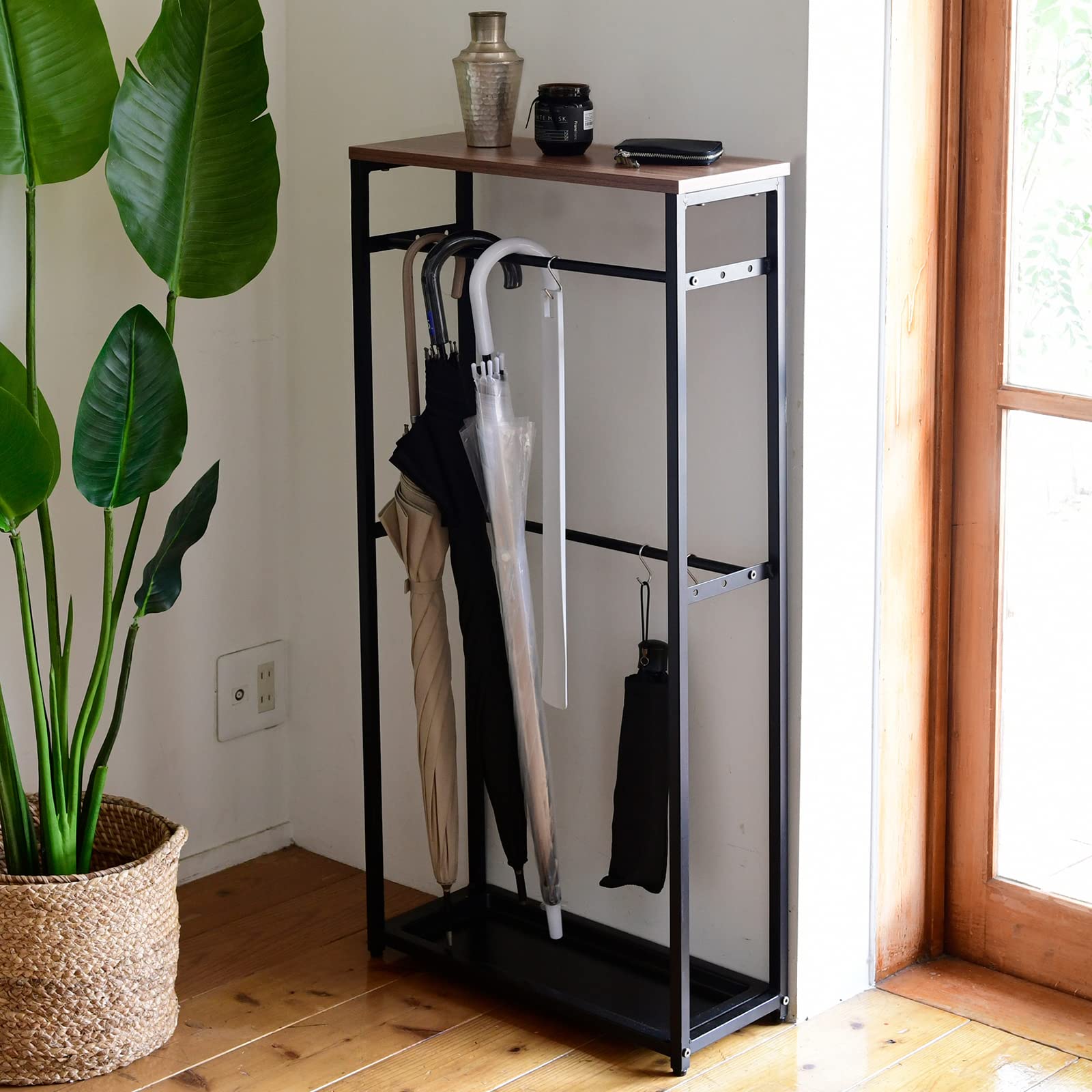 木製の天板とスチールの本体でできた傘掛け。奥行20cmなので、スリムにスマートに傘を収納できます。脚にはアジャスターが付いているので、お使いになる床面に合わせて調節ができ、ガタ付きをおさえることができます。天板は芳香剤や鍵などが置けて便利です。