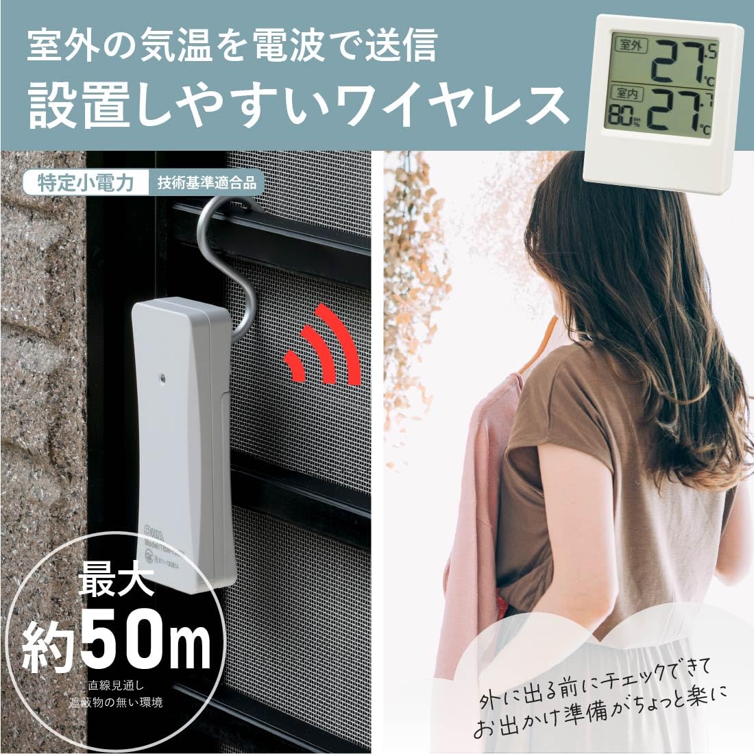 【 特 長 】 ◆室内の温湿度、室外の温度を計測できます ◆屋外に送信機を設置して温度計測、最大約50mの距離を電波で送信